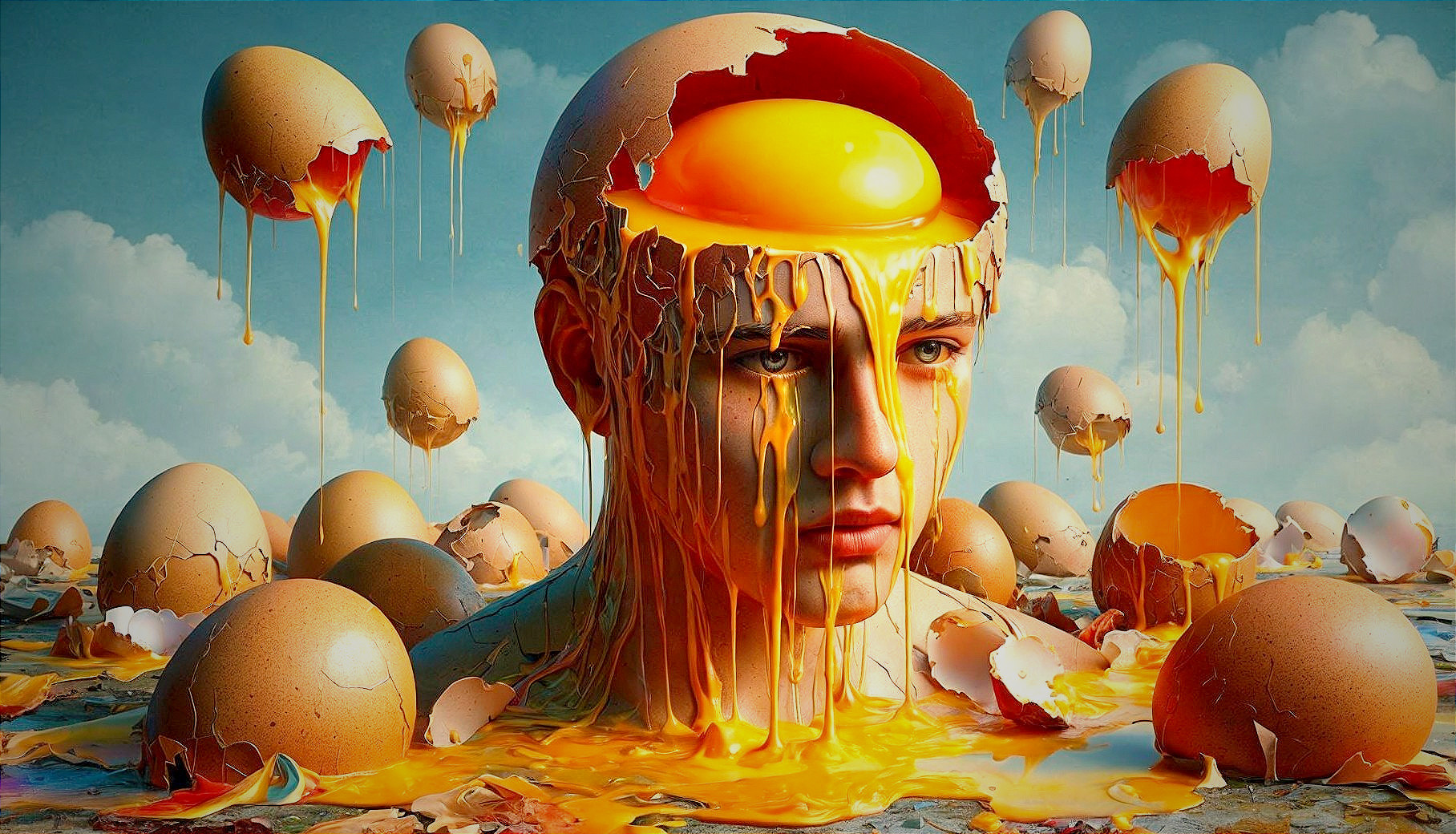 A surreal scene features a human head made of eggshell, with a bright yellow yolk spilling out. Surrounding it are cracked eggs, creating an otherworldly landscape filled with vibrant colors.