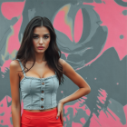 A young woman with long, wavy hair stands in front of a vibrant pink backdrop. She wears a cropped denim shirt and red high-waisted pants, exuding a confident and stylish vibe.
