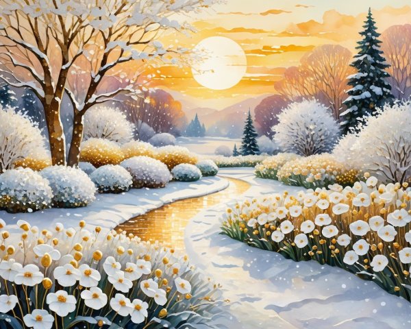 A serene woman in a straw hat holds a yellow flower, dressed in a loose white top and denim overalls. Soft, muted colors and a dreamy background of wildflowers enhance the tranquil scene.