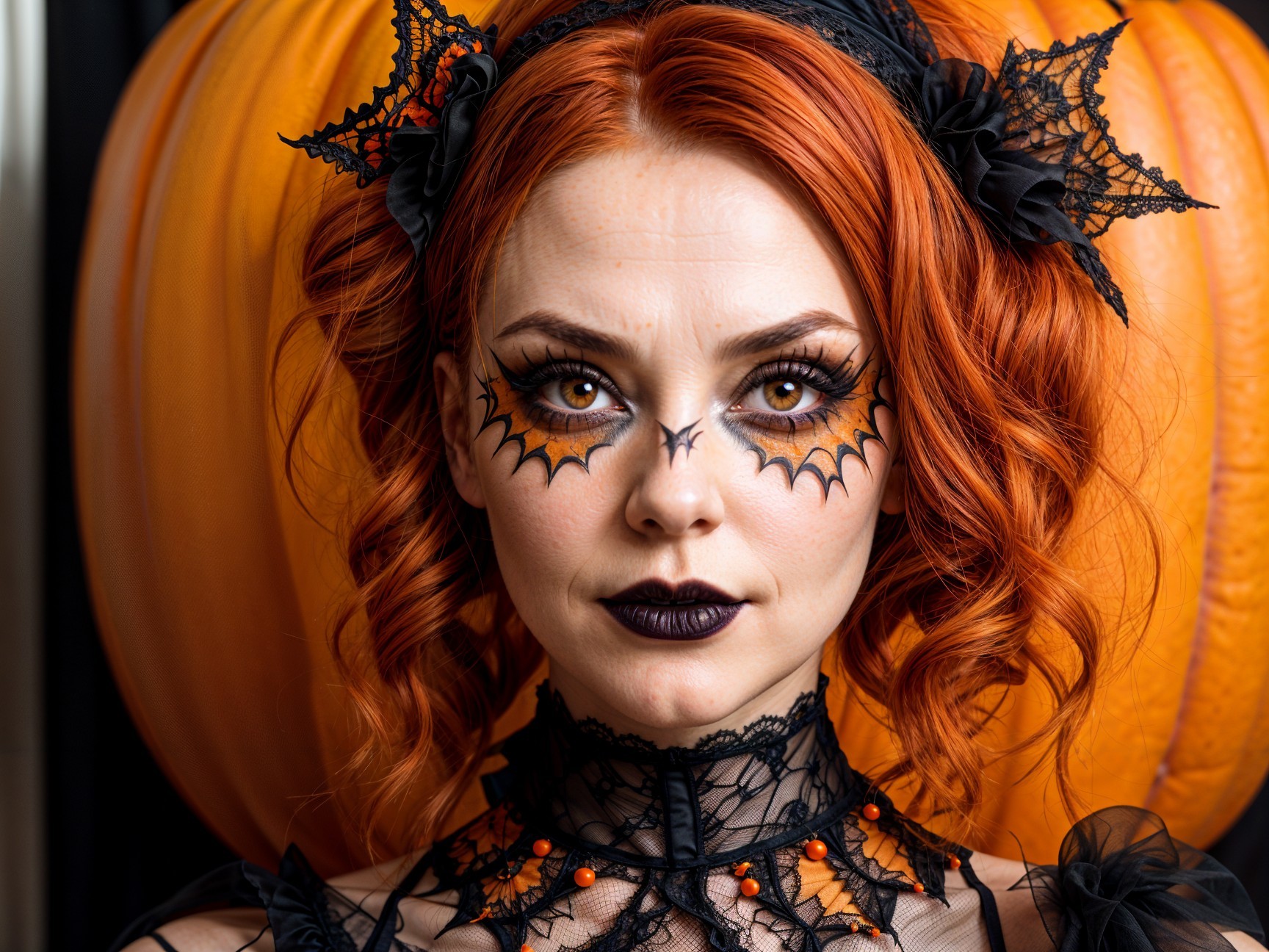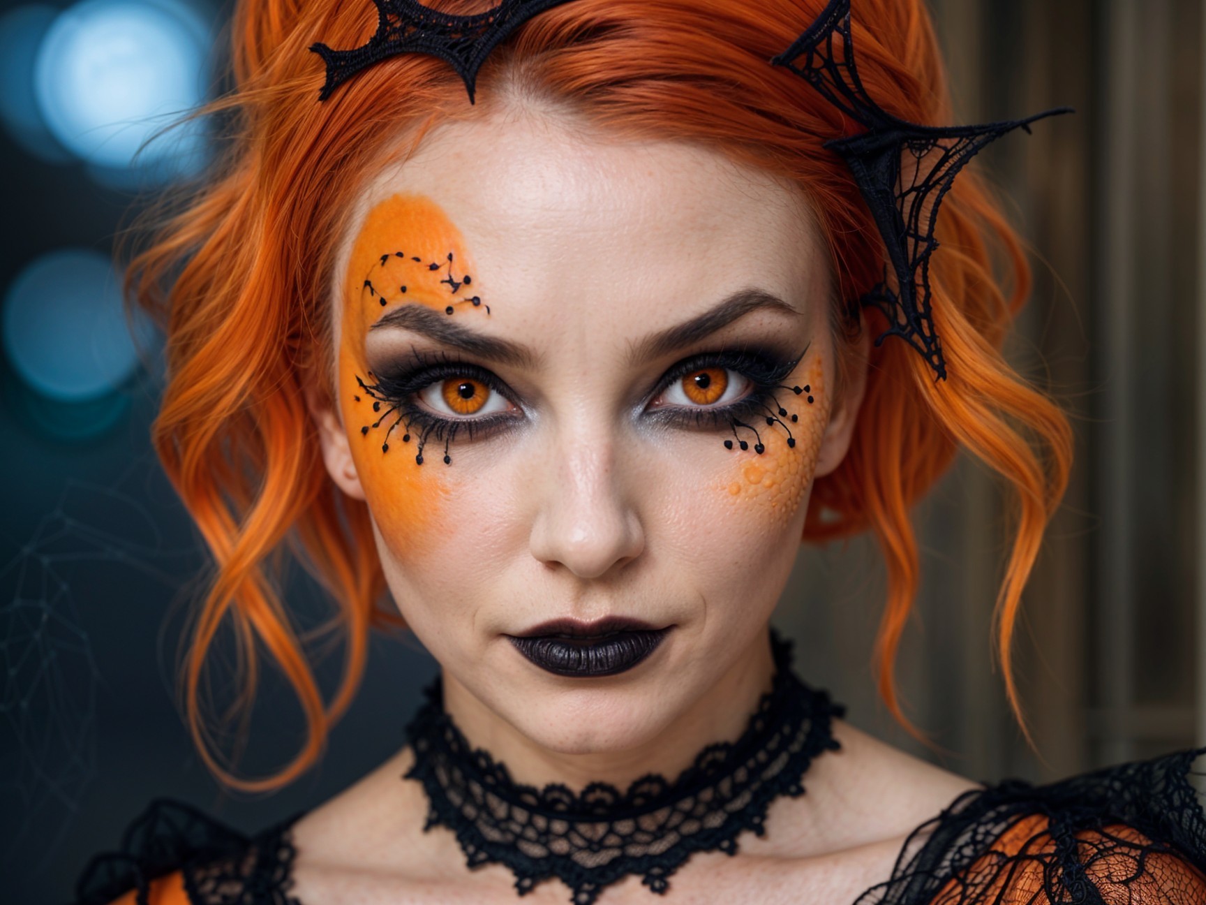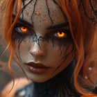 A striking woman with vivid red hair and intricate spiderweb makeup poses against an orange backdrop. Her haunting look features bold eye designs and dark lipstick, creating an eerie Halloween aesthetic.