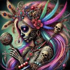 A vibrant, colorful portrait of a woman adorned with a feathered headdress and intricate makeup, featuring skull motifs and bold jewelry, exuding a festive and mystical spirit.