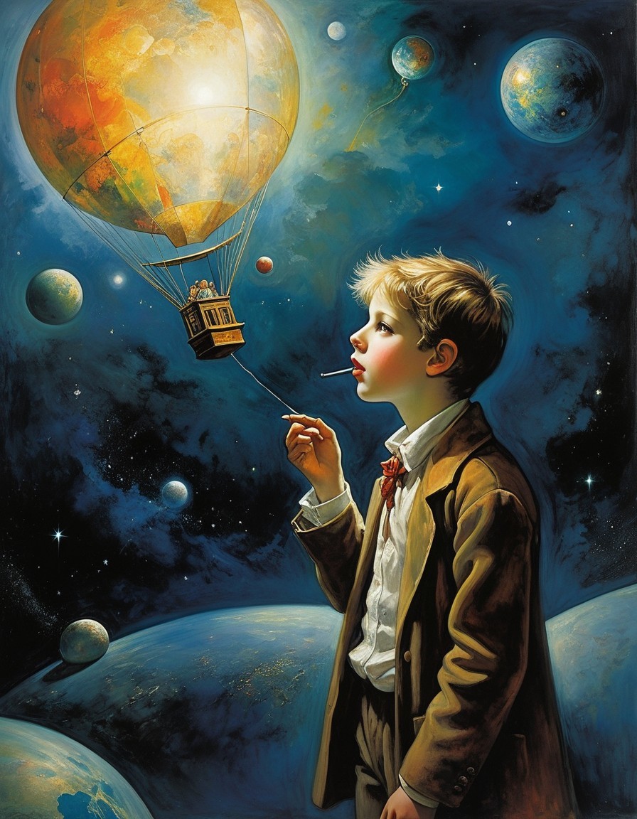 A young boy in a brown suit admires a vibrant hot air balloon soaring through a starry cosmic backdrop, surrounded by colorful planets, evoking a sense of wonder and adventure.