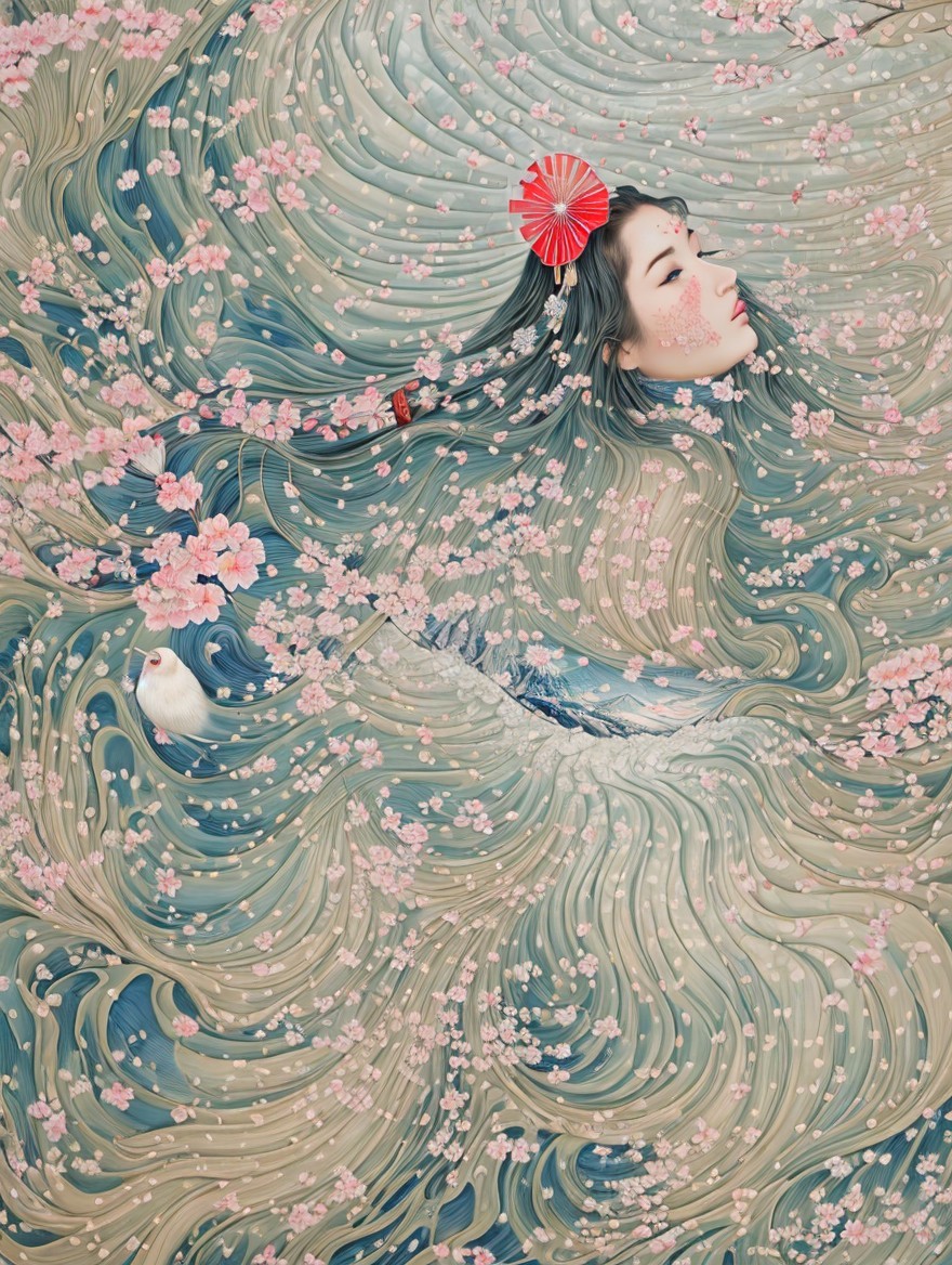 A woman in a kimono blends with a sea wave pattern, surrounded by cherry blossoms, evoking a serene and artistic aura.