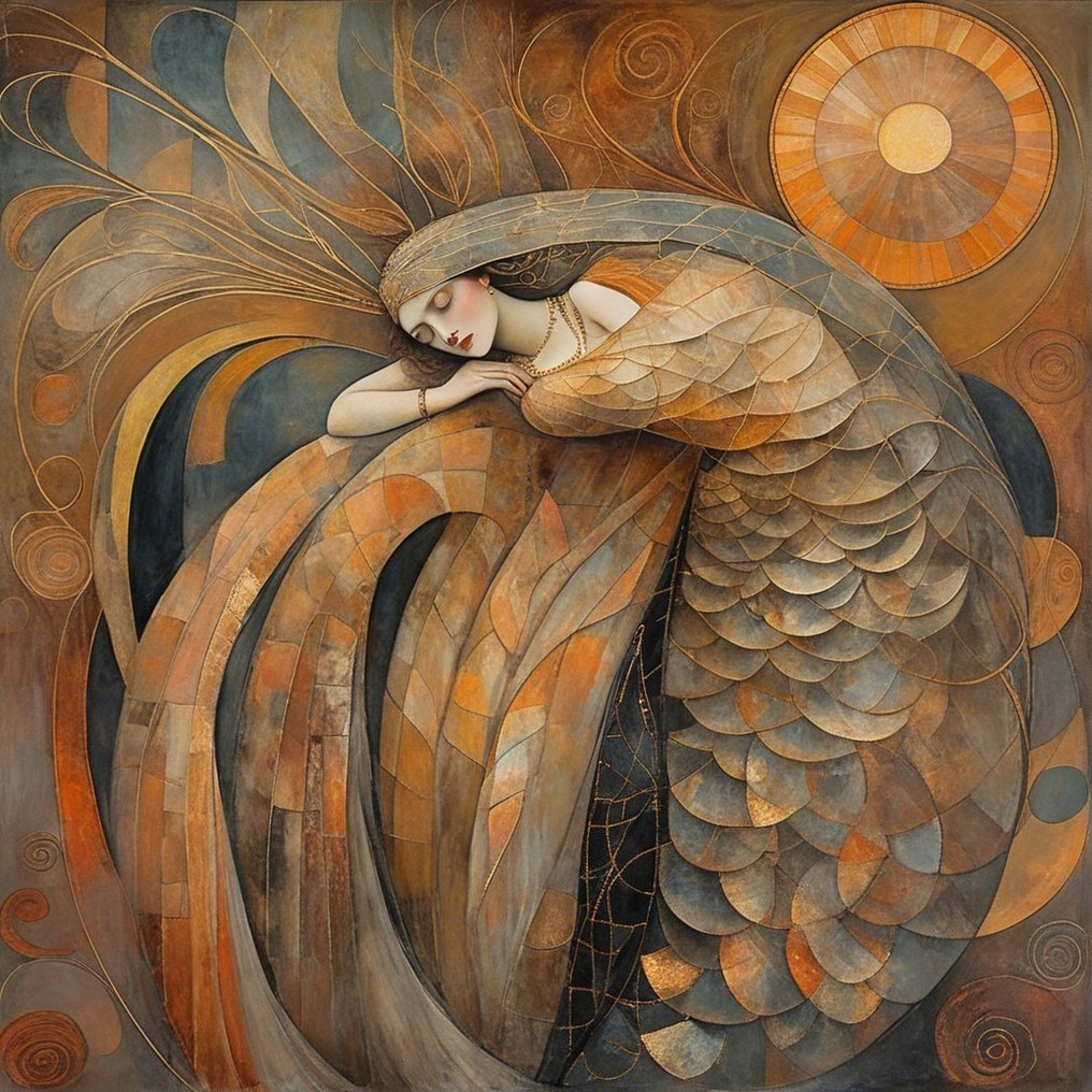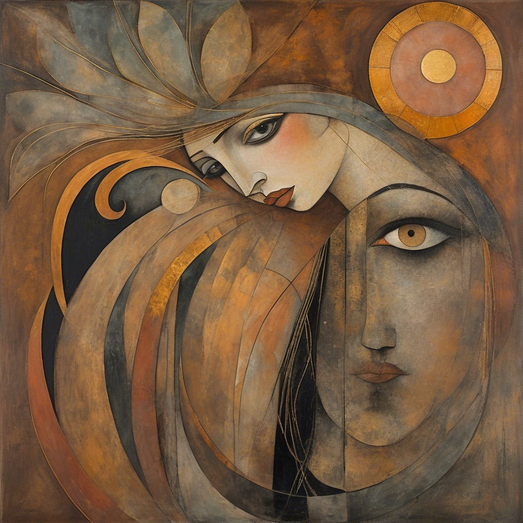 A captivating portrait featuring a woman with an elongated face and expressive eyes, set against a backdrop of warm, earthy tones and geometric shapes, exuding a sense of tranquility and mystique.