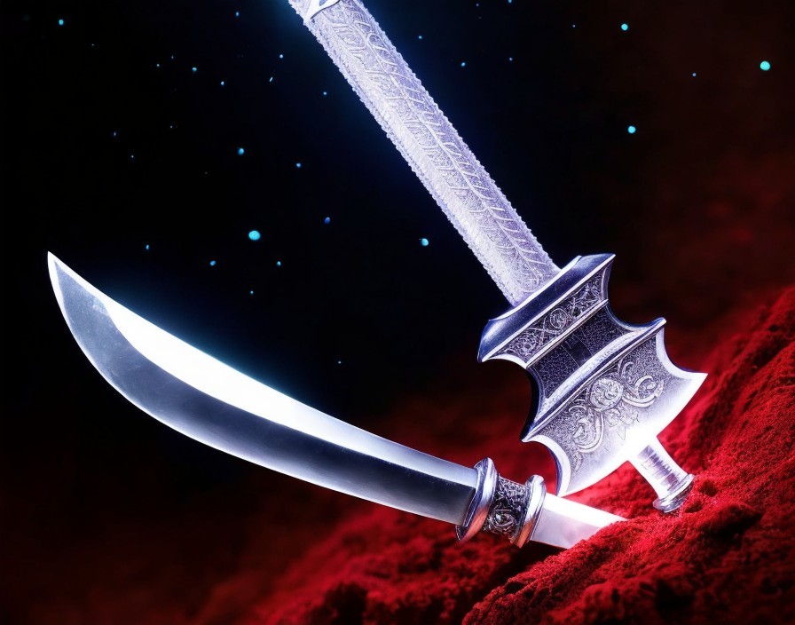 Ornate Sword on Red Fabric with Soft Lighting
