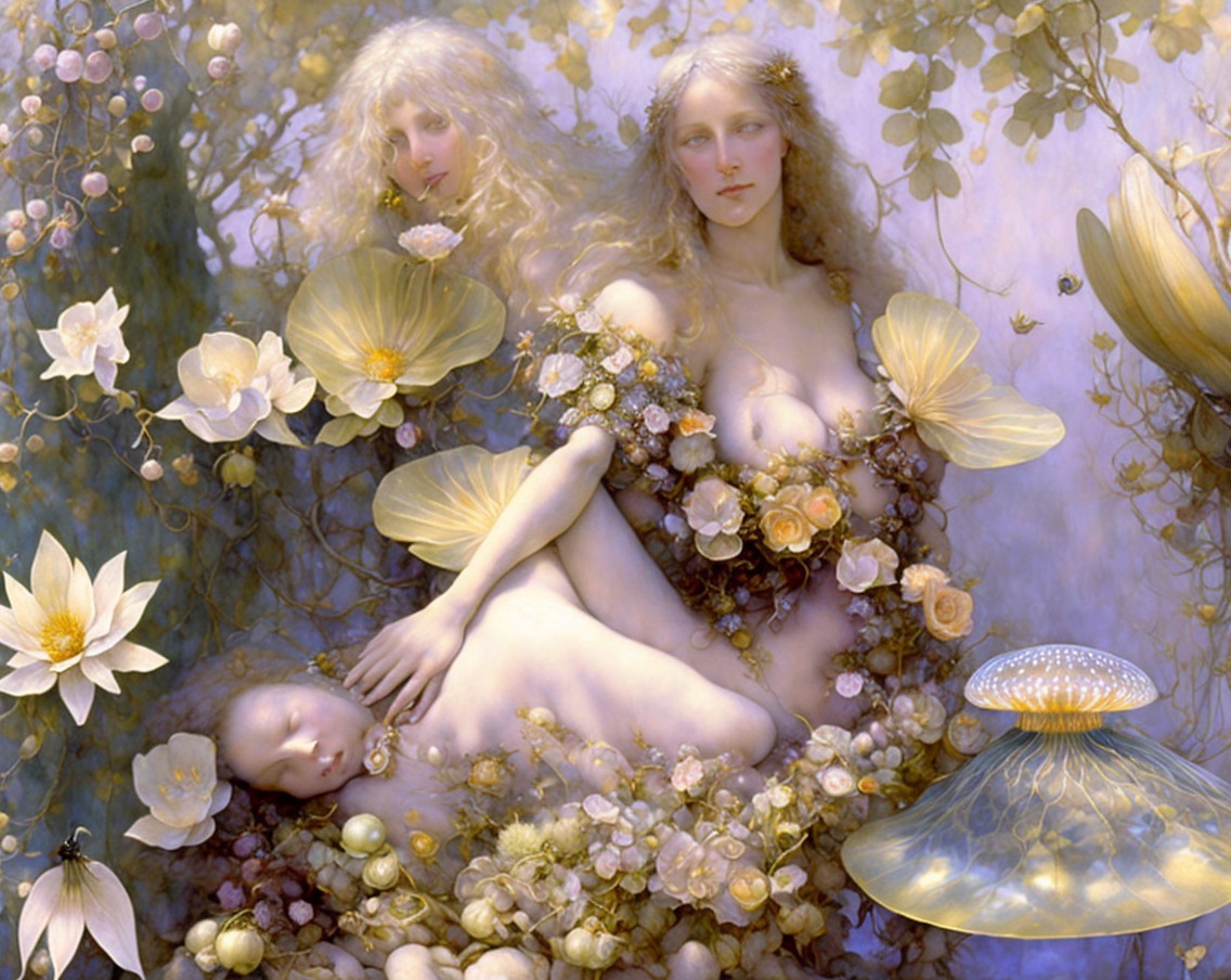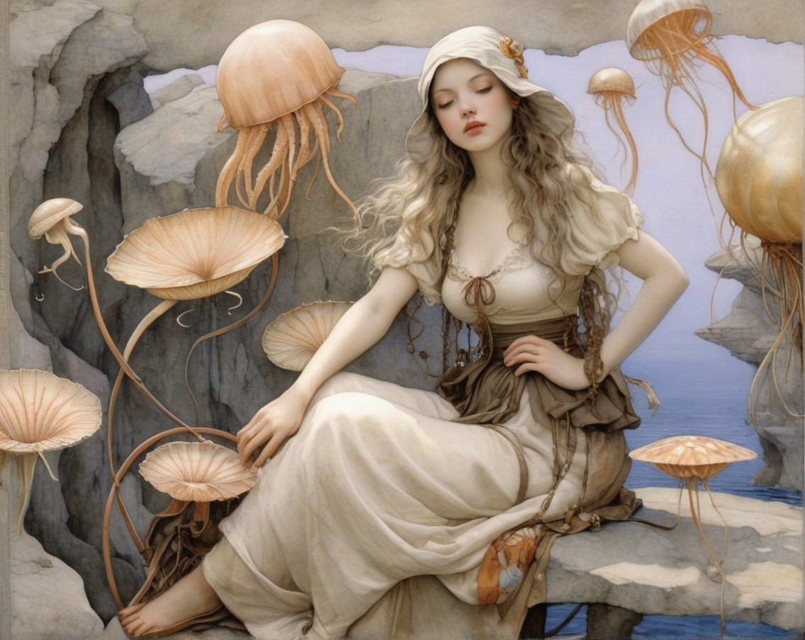A painting of a woman sitting by a spherical structure on a beach, with floating jellyfish nearby, in a dreamlike, ethereal scene.
