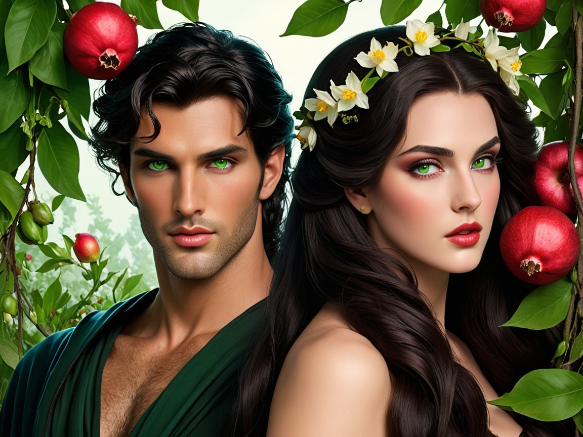 A striking couple stands amidst vibrant greenery, adorned with flowers and pomegranates. Their expressive features exude a blend of elegance and mystery, capturing a timeless romance.