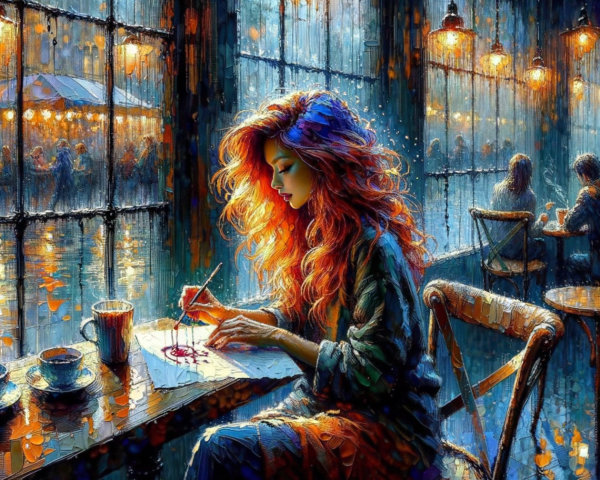 In a vibrant art studio, a woman paints a colorful canvas while a man observes her creation. The walls are adorned with various abstract artworks, and the atmosphere is creative and lively.