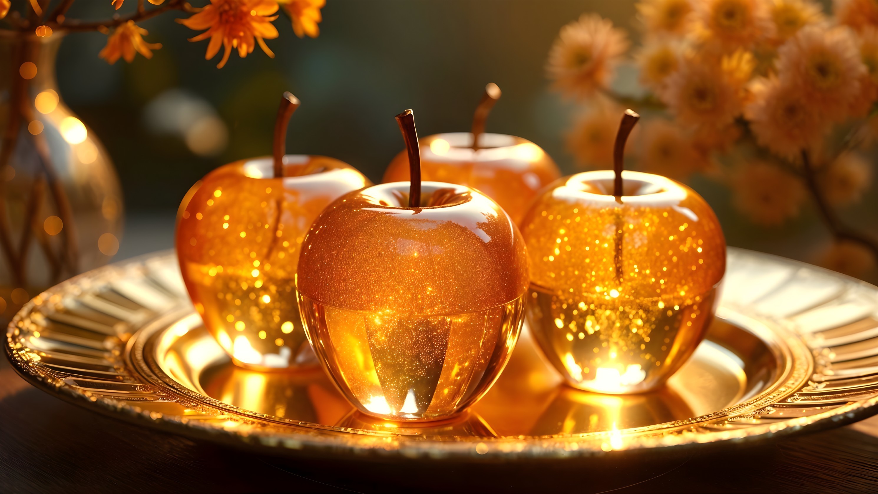 A stunning digital painting features shimmering crystal apples on a gilded plate and delicate golden blooms in a crystal vase. The hyper-detailed composition showcases vibrant colors and intricate details against a dark backdrop, creating a dynamic visual experience. Enhanced by HDR and volumetric lighting, the artwork employs the golden ratio for harmonious balance, resulting in a masterpiece of elegance and artistry