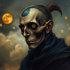 The image features a surreal, skeletal figure with a bald head and an intricate skull design, set against a cosmic background of planets and swirling clouds, evoking a mystical atmosphere.