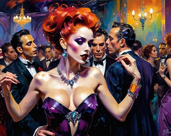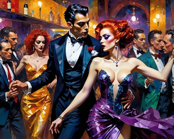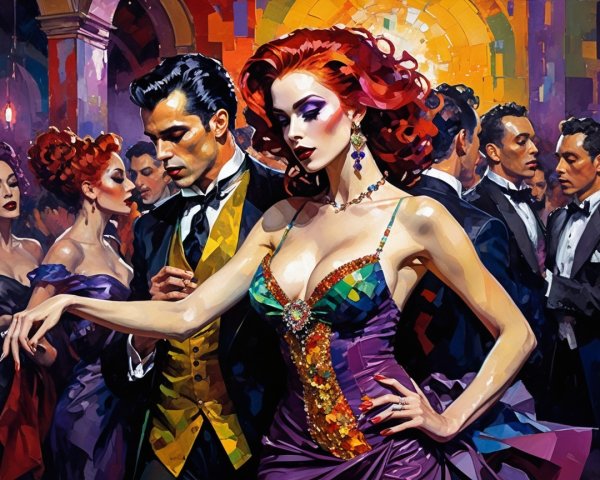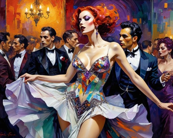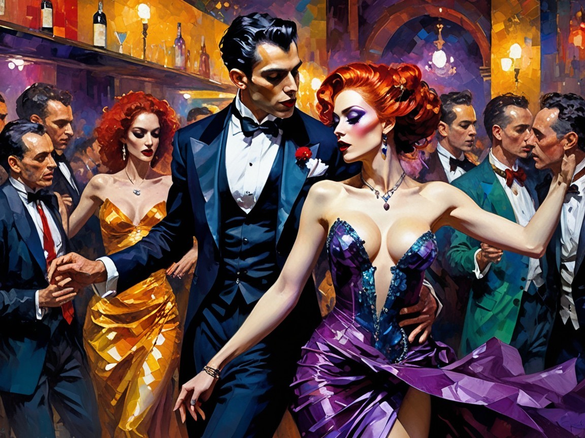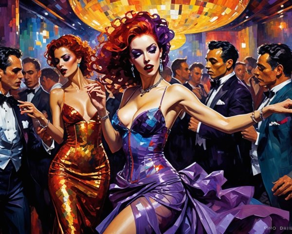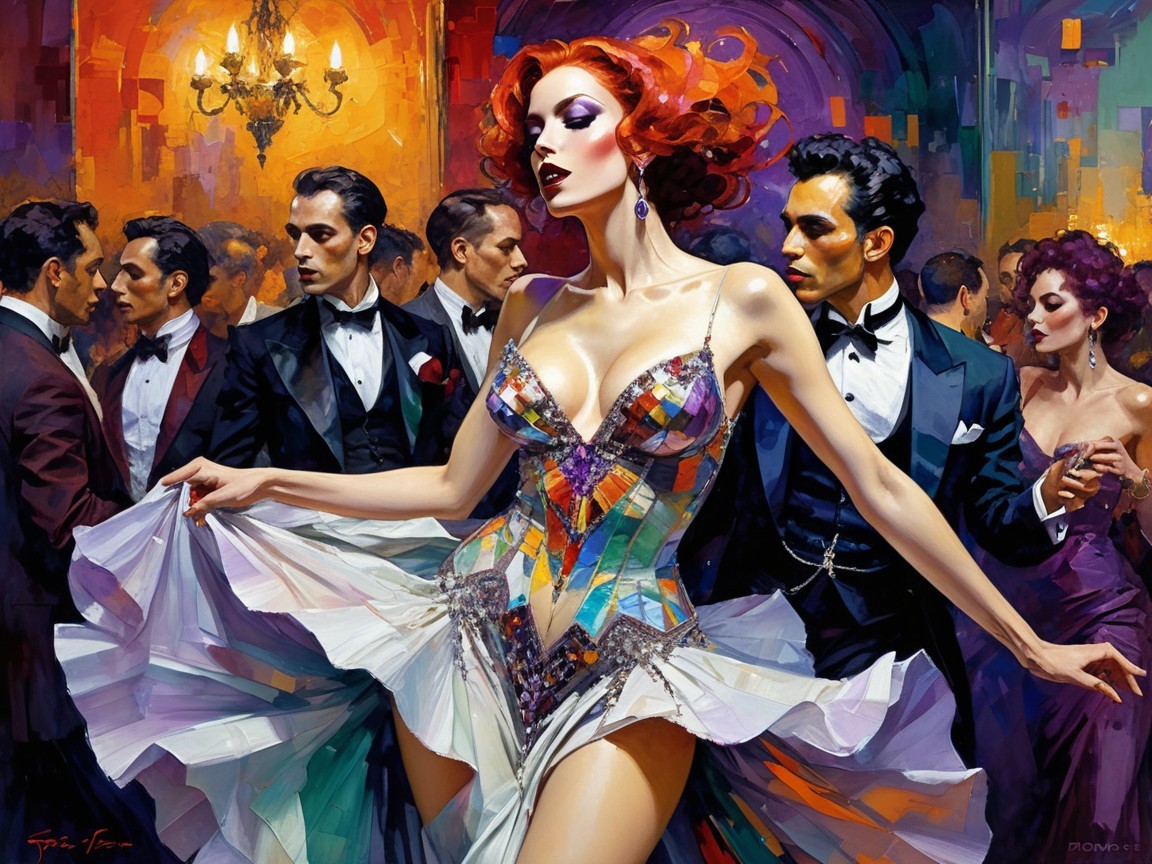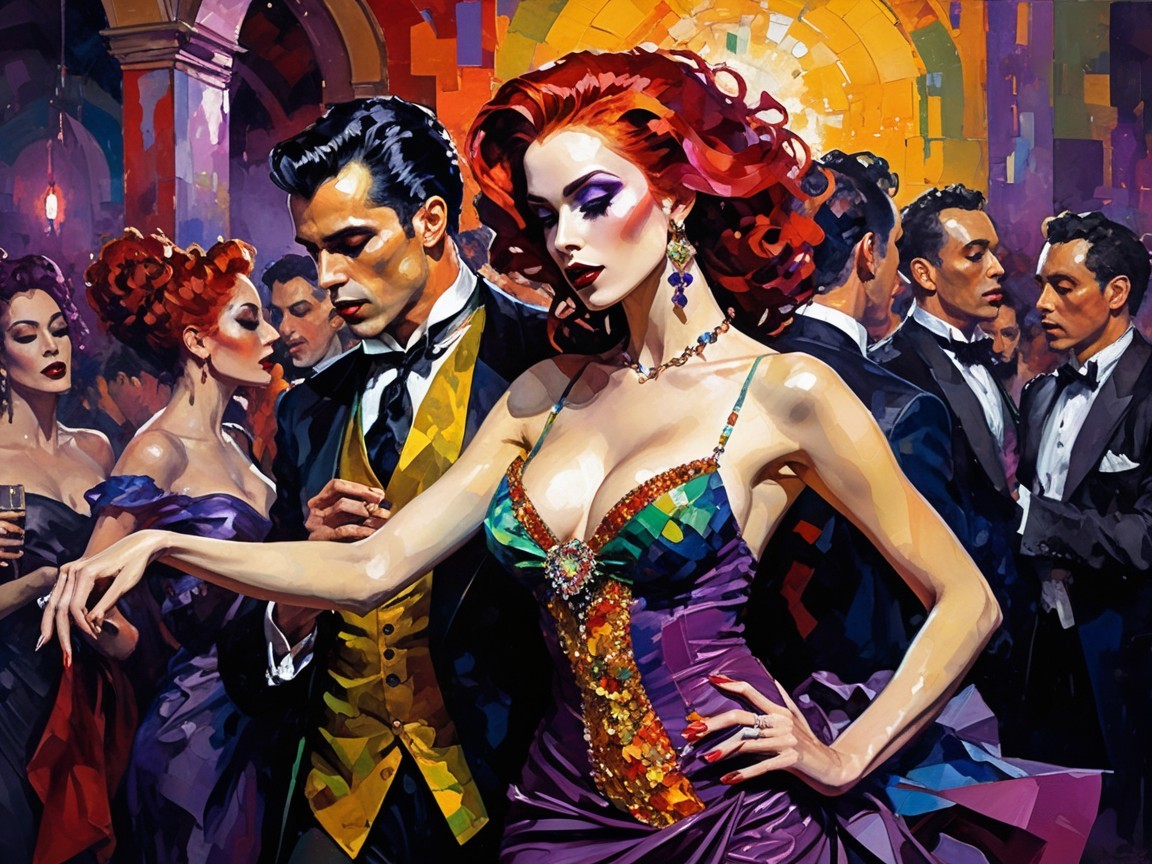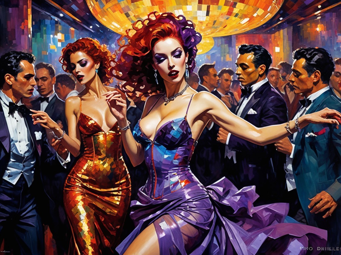 A vibrant nightclub scene comes alive with elegant dancers, showcasing exquisite details in a colorful, hallucinogenic style. The artwork captures dynamic textures and a surreal atmosphere, inviting viewers into a mesmerizing experience.