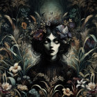 A striking woman with long black hair and a ornate crown stands amidst lush flora. Her dark attire contrasts beautifully with white roses, enhancing her ethereal, mysterious aura.