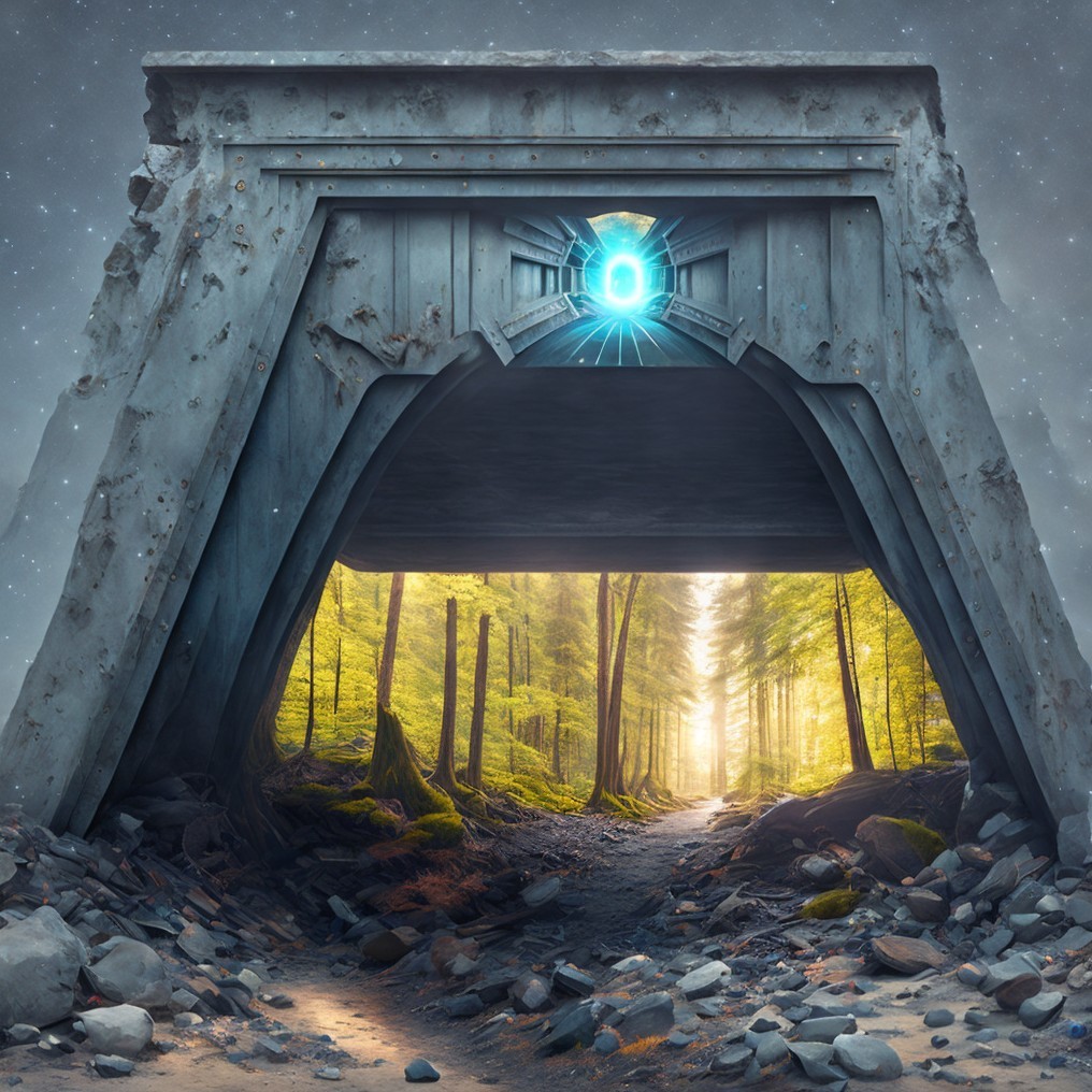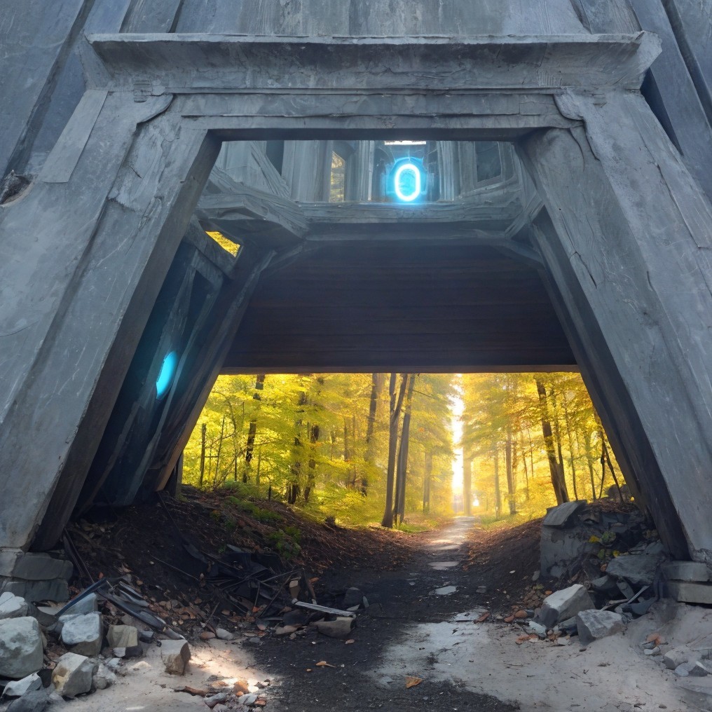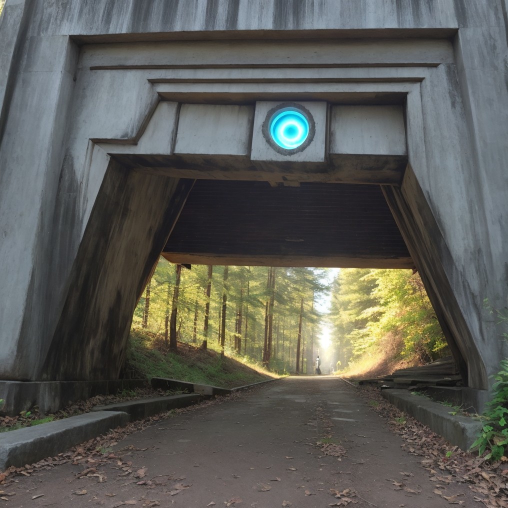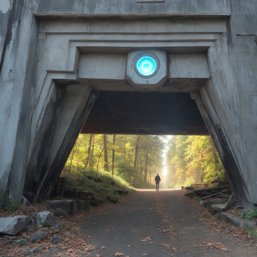 A trail runs under a concrete structure with a round blue light fixture, surrounded by trees with hints of autumn colors.