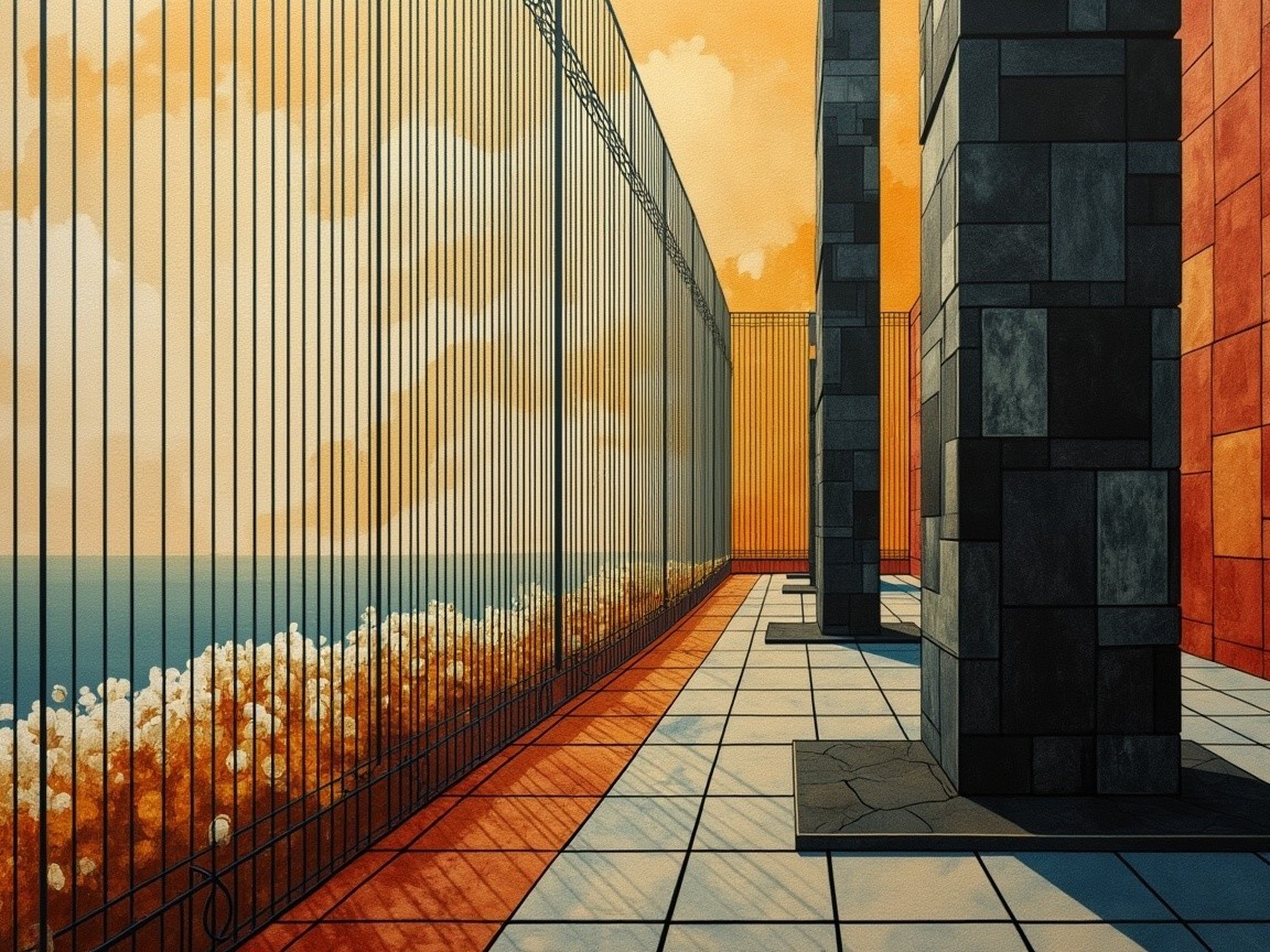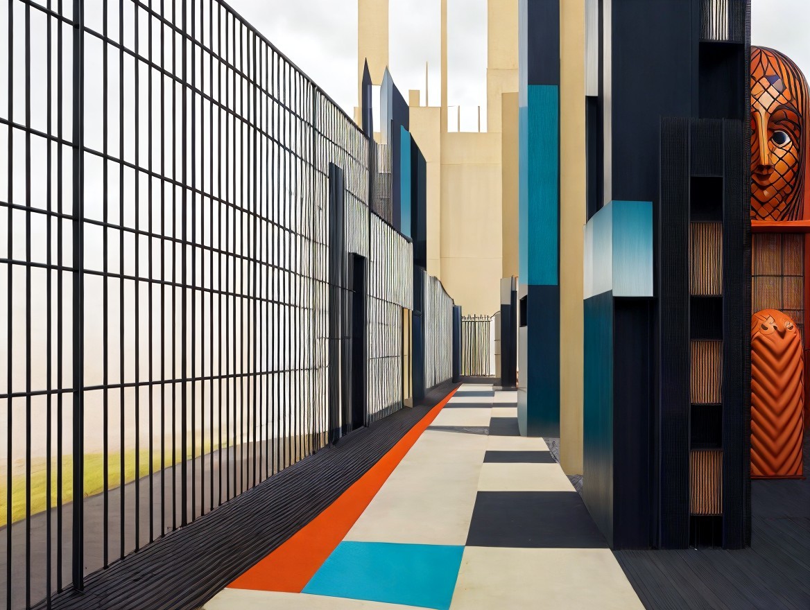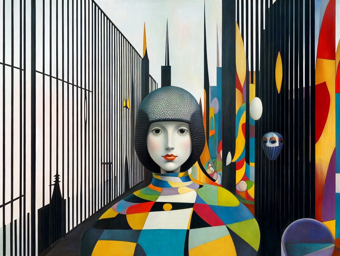 The image features a surreal, stylized female figure with a geometric headpiece, surrounded by abstract shapes and vibrant colors, merging structure with a dreamlike atmosphere.