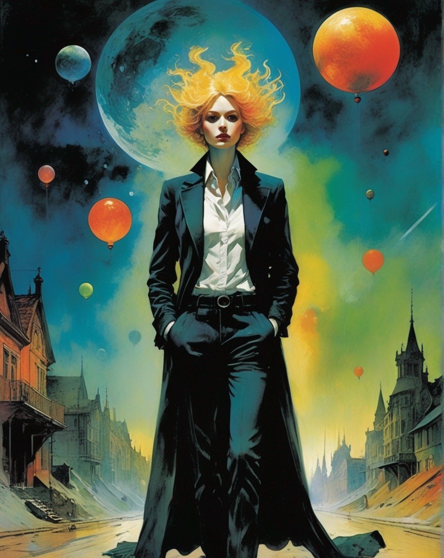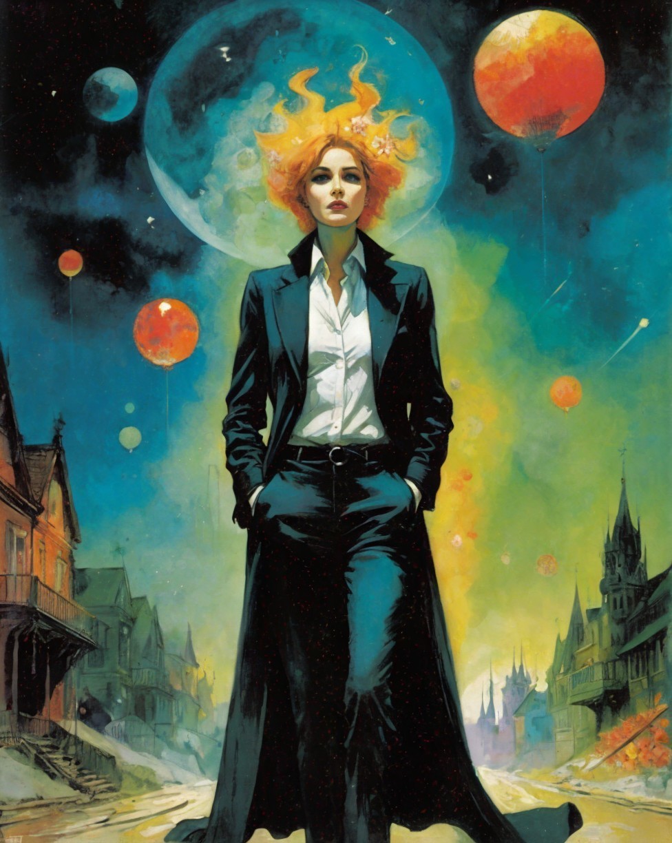 A striking woman with fiery hair stands confidently in a surreal cityscape with whimsical planets looming in the sky.