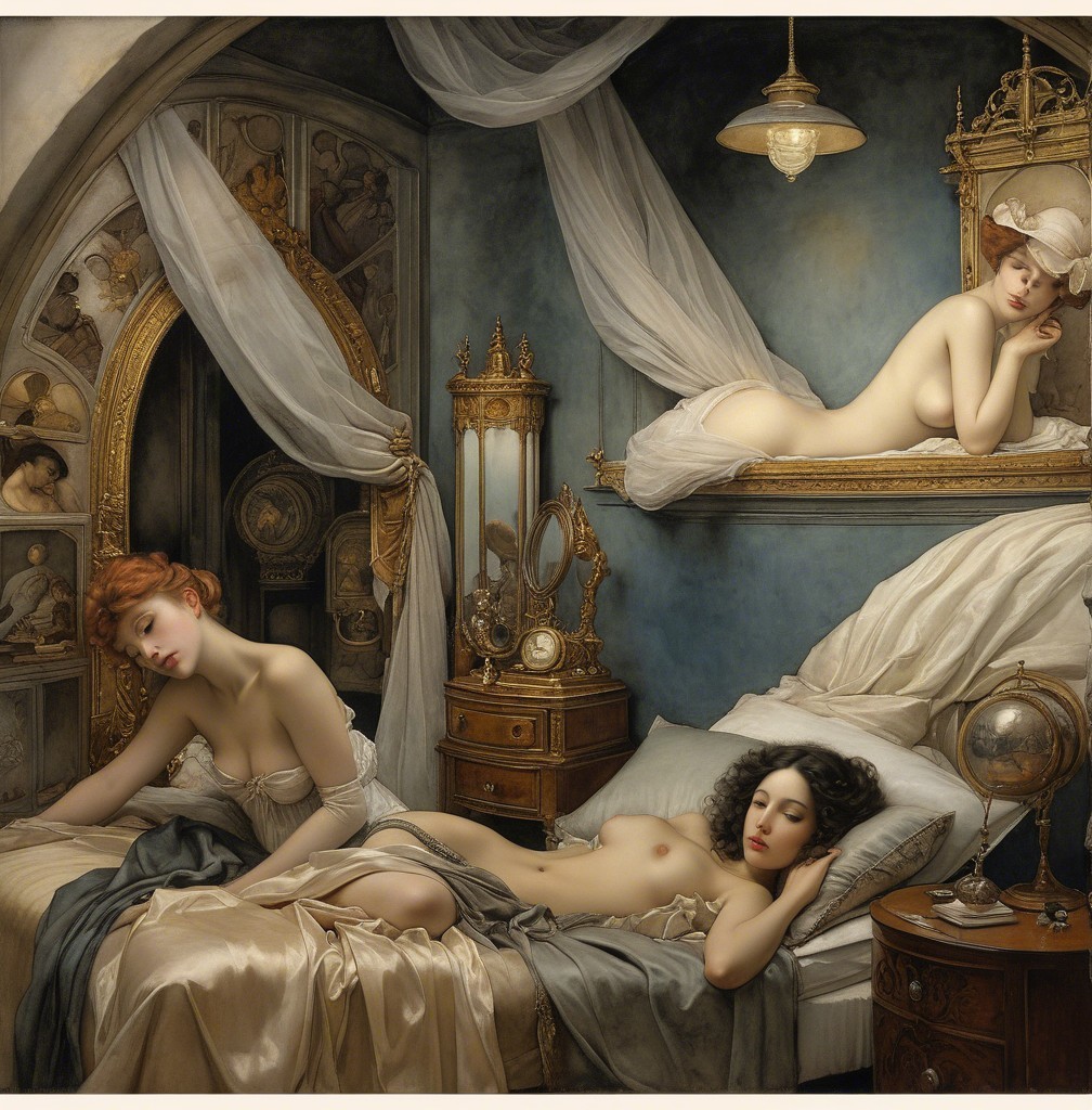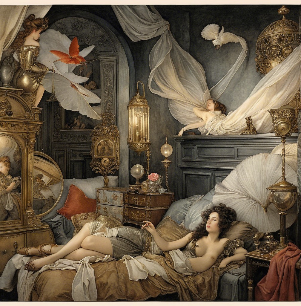 A serene and elegantly styled room features a beautiful woman in vintage lingerie, reclining on a bed. Soft lighting and opulent decor create a dreamlike, intimate atmosphere.