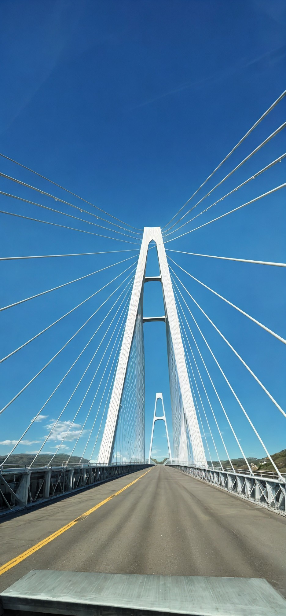 A towering cable-stayed bridge spans above a bustling cityscape at dusk, with dramatic clouds overhead and lights aglow.