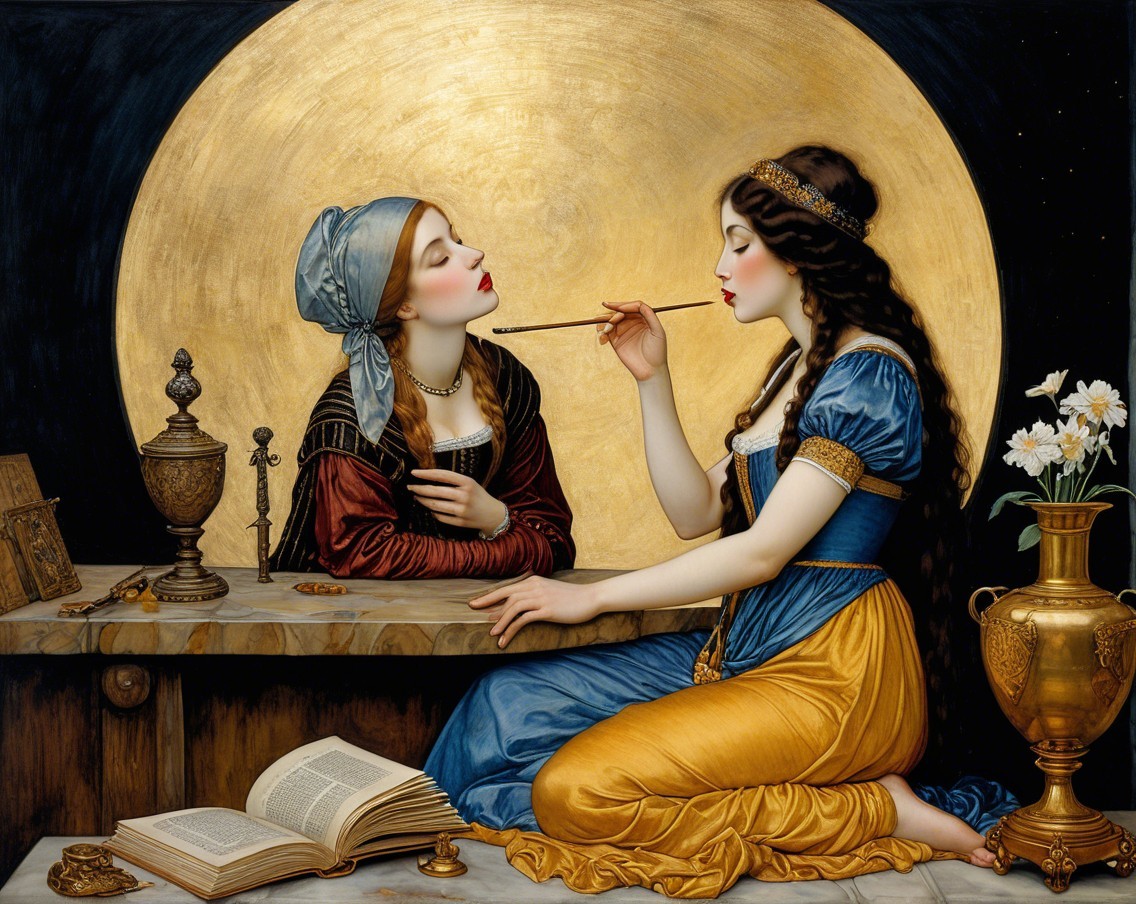 Two elegantly dressed women share an intimate moment, seated by a table with a book and flowers. A small dog sits nearby, as a large, glowing moon rises in the background, enhancing the scene's warmth.