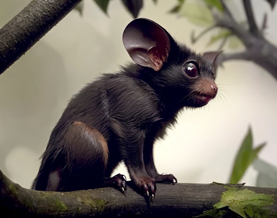 A black bat with prominent ears and sharp claws perched on a tree branch amidst green leaves.