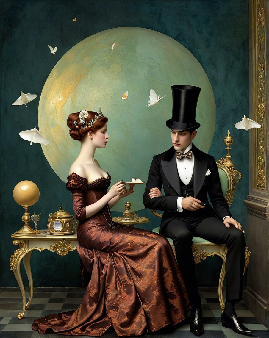 A stylish couple sits together in elegant attire amidst a celestial backdrop. The woman in a stunning red gown holds a wine glass, while the man in a top hat shares a moment of sophistication.