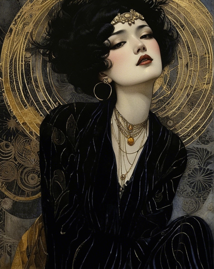 + Prompt:Beautiful woman, flapper, roaring 20s, great gatsby Medieval Japanese Artists Sumi-e Style, Velvet Black, Velvet Indigo, Shabby, Dull Gold, Amber Gray, Golden Ratio, Surreal Fantasy, Elegant, High Definition Ultra Fine 3D Line, Zenangle Style, Watercolor Patchwork , Arthur Rackham Style, Paul Kidby, Gediminas Prankevicius, Jacek Jerka, Extremely Detailed, Intricate, Thoughtful, HDR, Fractal, Beautiful, Award Winning, Fantasy Look, Fantasy, Crisp Quality
