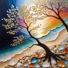 This vibrant artwork features a stylized tree with intricate leaves and a radiant sun, set against colorful waves and a sandy beach adorned with sea shells, creating a harmonious natural scene.