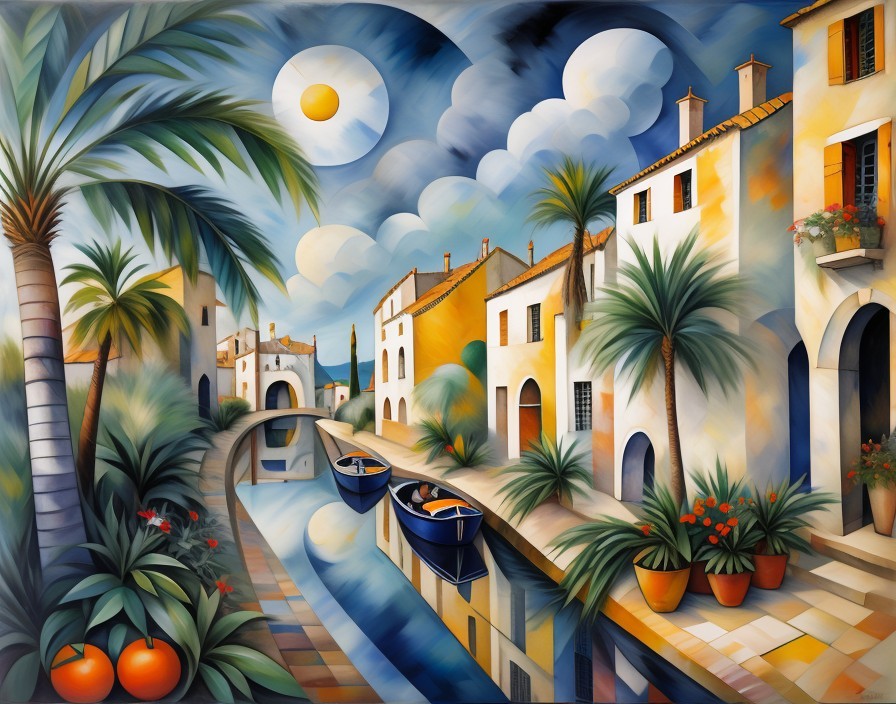 Mediterranean Canal Scene with Colorful Boats and Houses