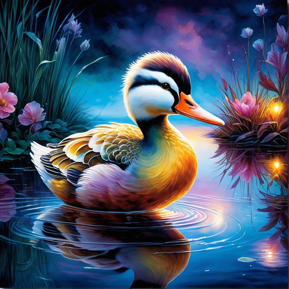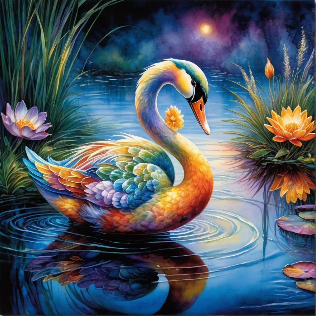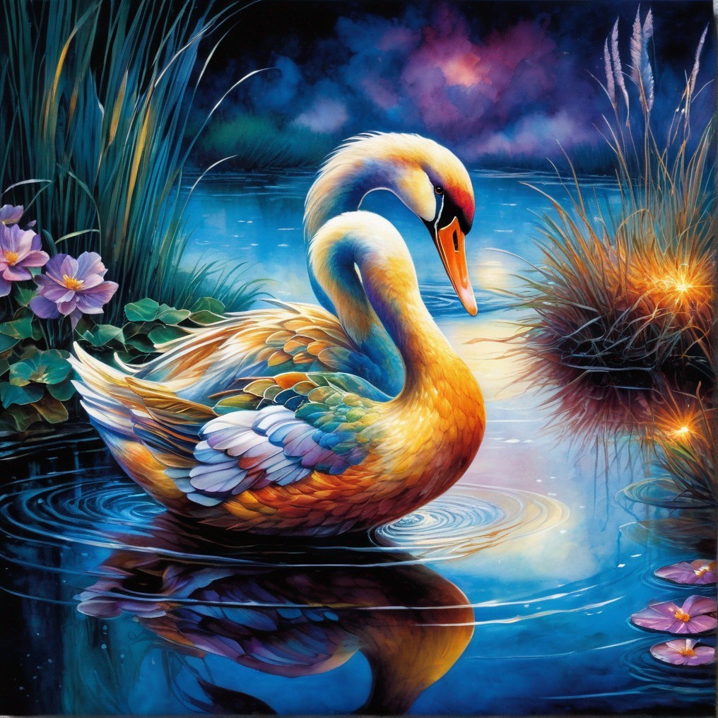 + Prompt:Watercolor in the style of Josephine Wall, Tomasz Allen Kopera, Dariusz Zawadzki, Andreja Peklar, Ivan Shiskine, beautiful complex pond, a small stream flowing into the pond from behind, an elegant, graceful stick across the stream with a path leading on the The right side around the pond leads through fields of tall grass, wildflowers and beautiful old trees. On the left side of the stream the path leads to an old stone house with a wooden porch, with a low stone fence in front and a garden full of flowers, trees on both sides of the house, some waterfowl can be seen on the pond and a heron stands on the bank of the pond, in the background you can see a hilly landscape