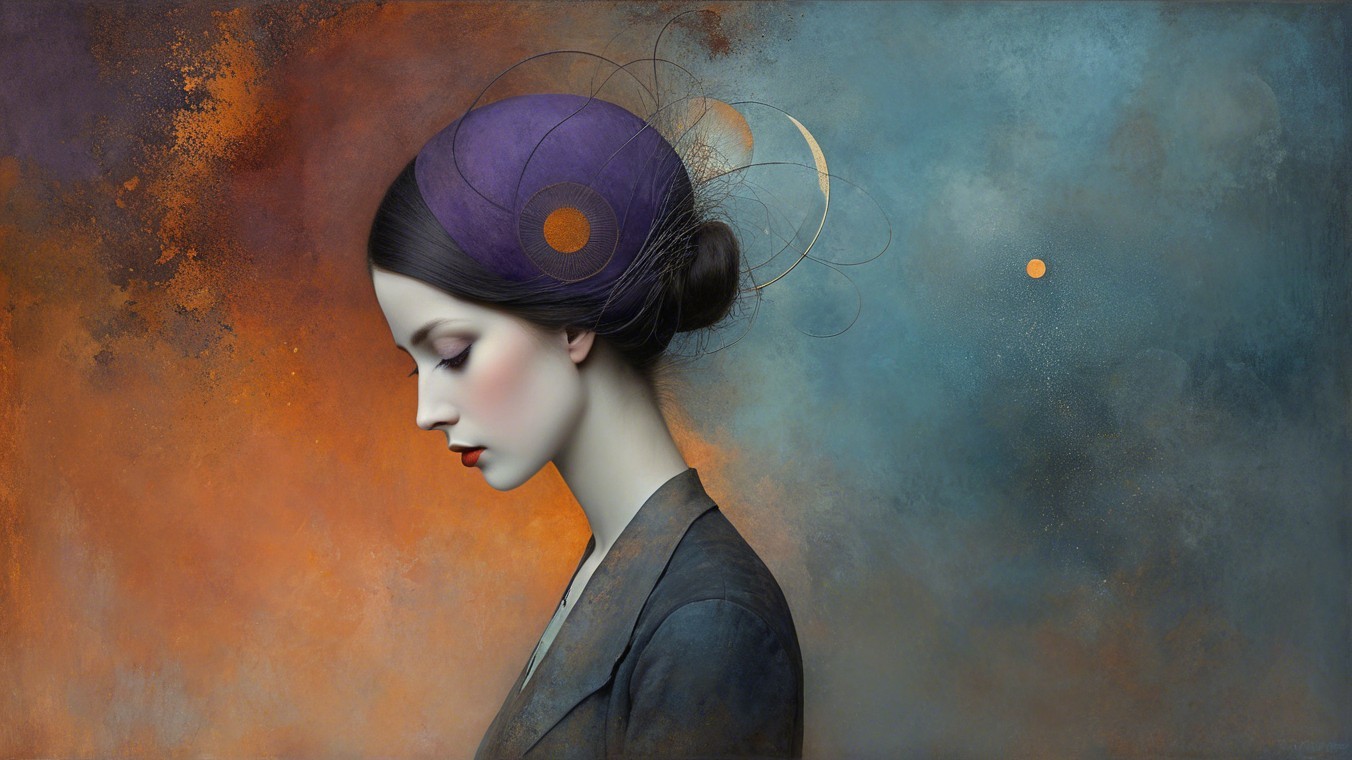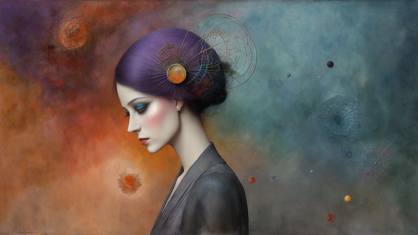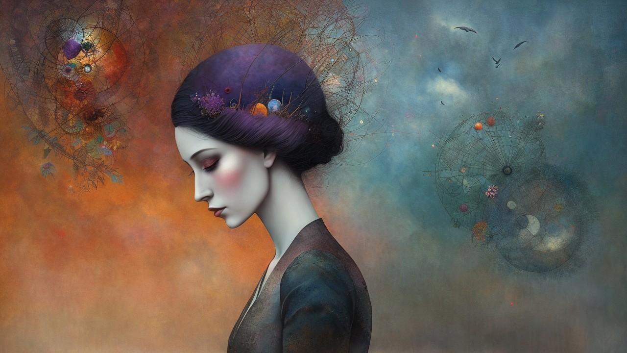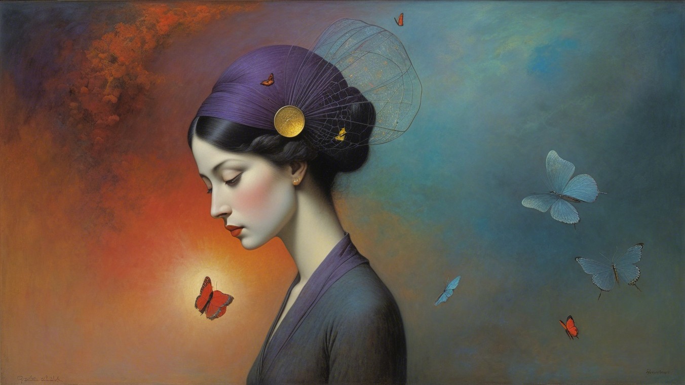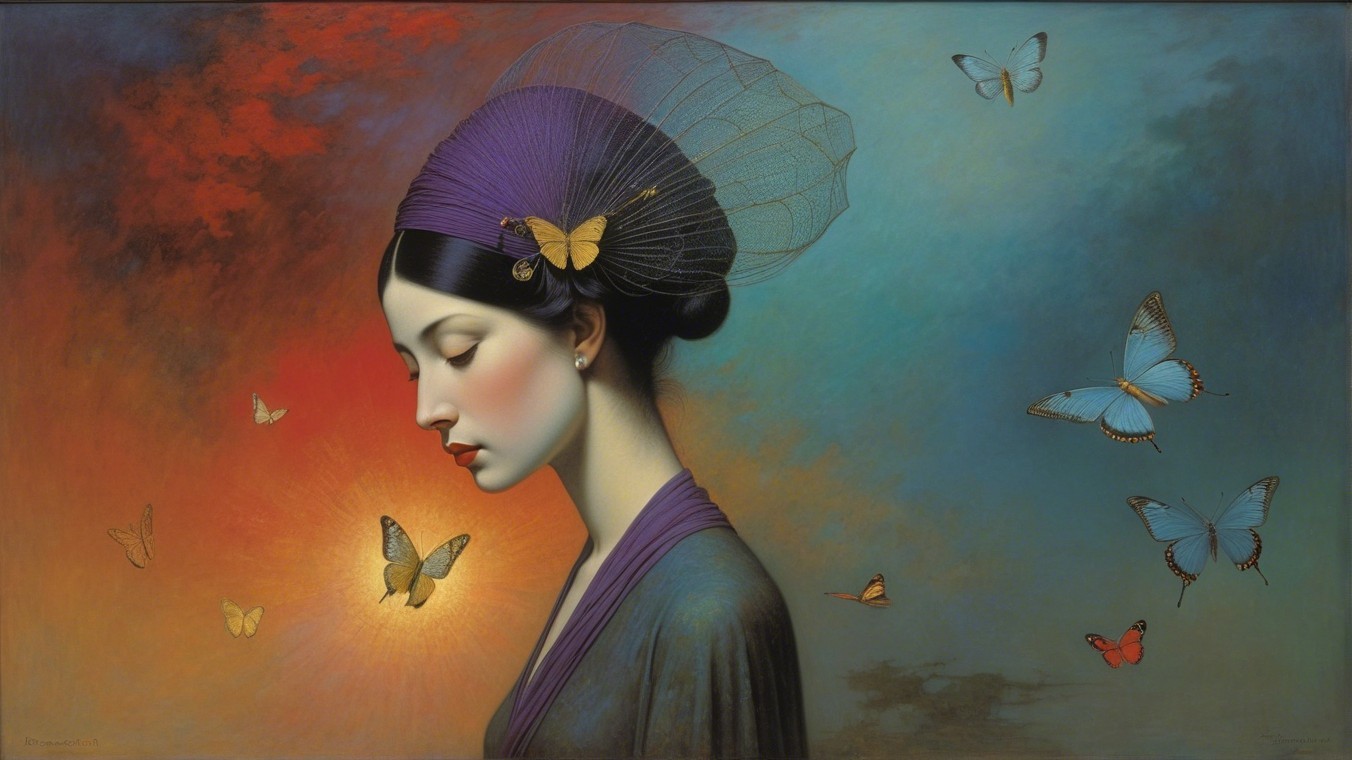 A serene girl with floral adornments and butterflies surrounding her, set against a vibrant backdrop of reds and blues. The scene captures a dreamlike calmness and beauty.
