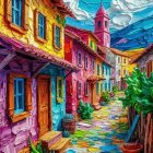 A vibrant, stylized landscape showcases colorful houses and a winding path under a starry sky. Two elegant Afrocentric women, adorned in intricate jewelry, embody beauty and strength in a dreamlike setting.
