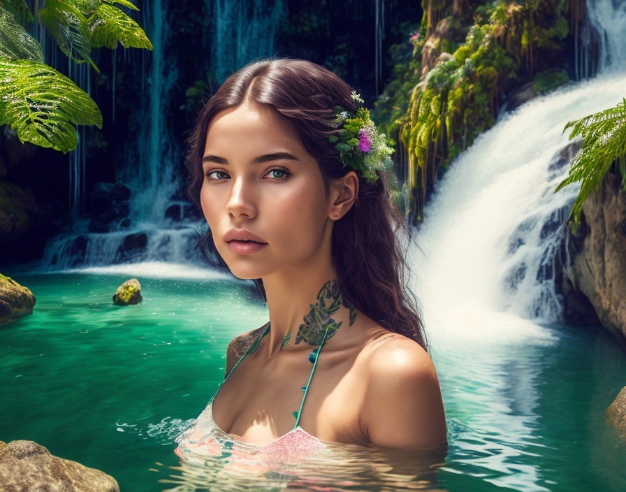 A woman with a floral headpiece stands before a scenic waterfall, sunlit water droplets on her skin, while another swims in the background.