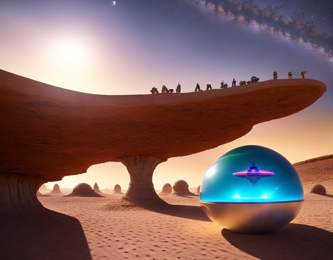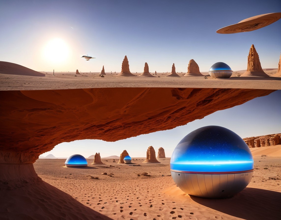 A sci-fi desert landscape with rock formations, multiple moons, a UFO in the sky, and a futuristic pod on the ground.