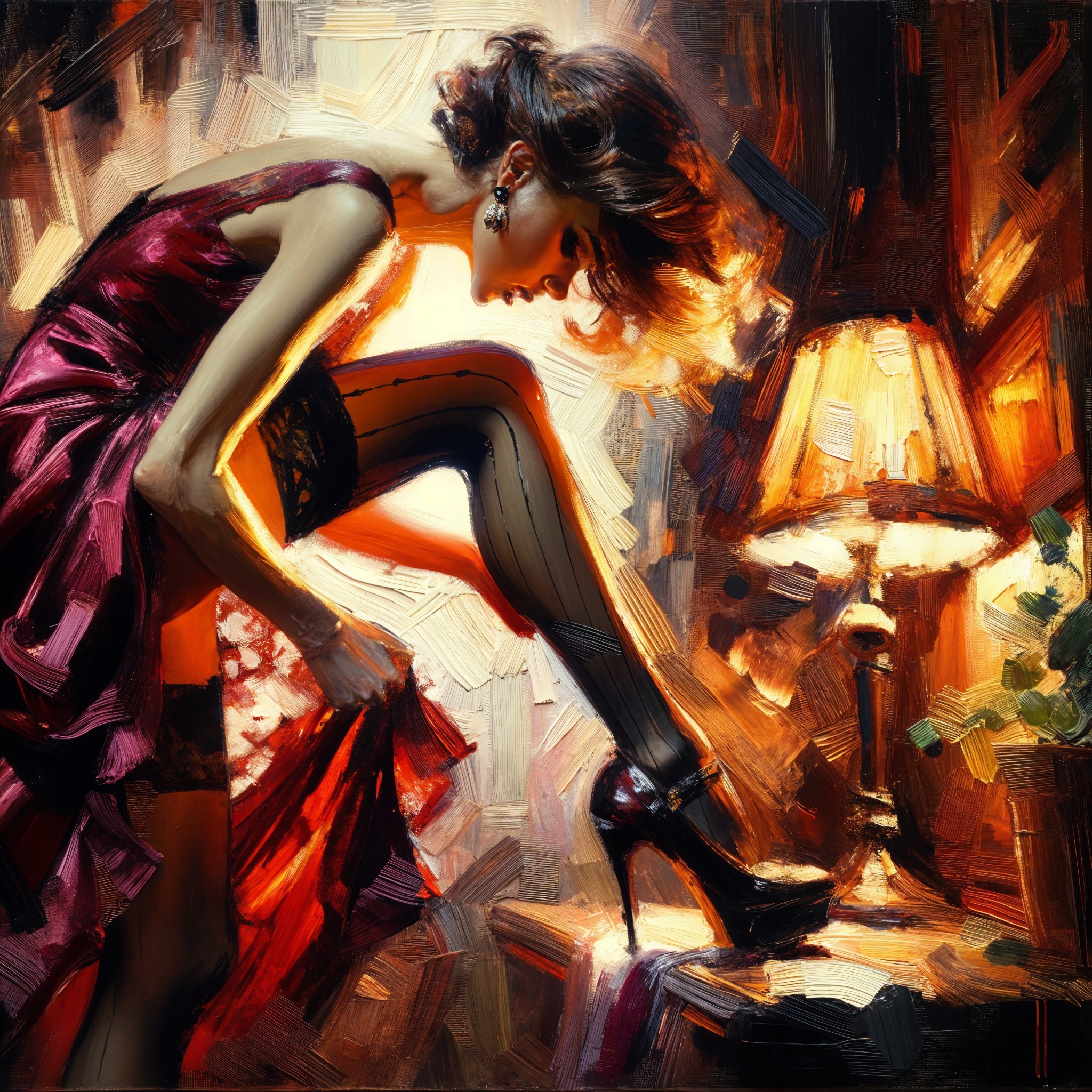 A textured oil painting depicting a woman in a red silk dress, bending over to adjust a stocking and put on a high heel, as warm light from a table lamp illuminates the scene from the right. The artwork has visible, prominent brushstrokes, creating a impressionistic and painterly effect.