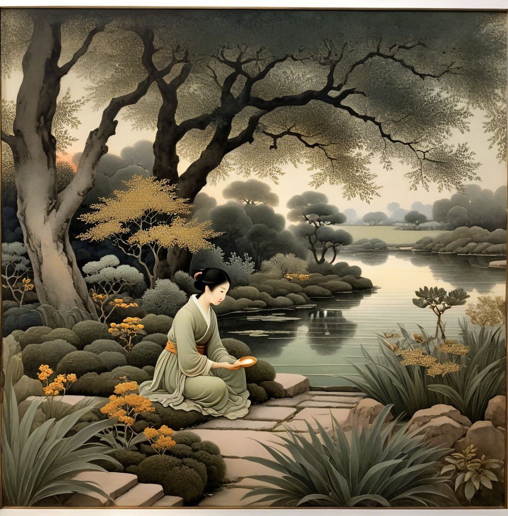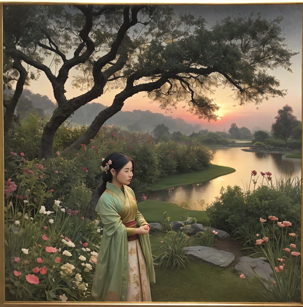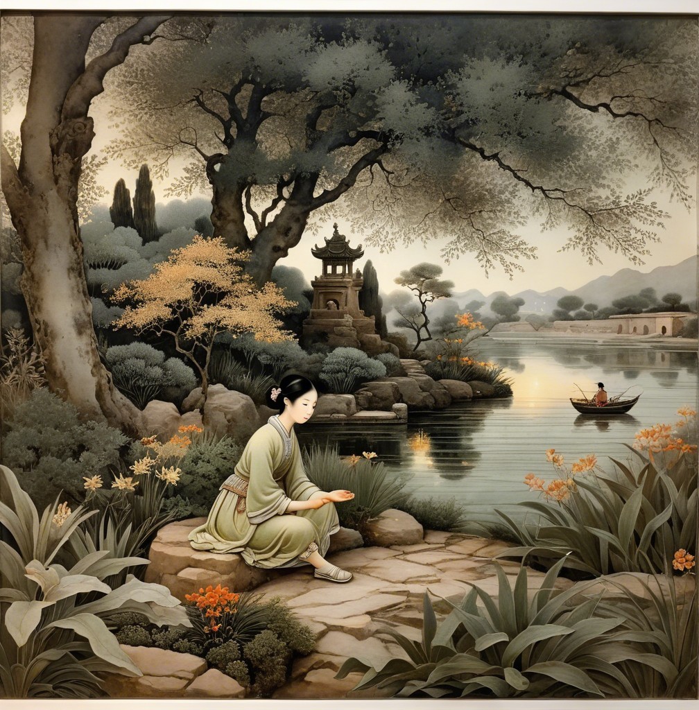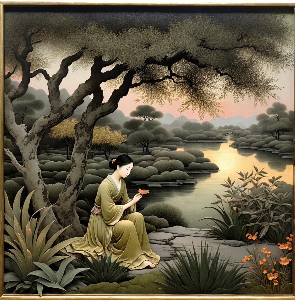+ Prompt:Girl in a beautiful garden at sunset, 3rd century Chinese miniature art, Velvet blush olive green, sage, Shabby, Dull Gold, Amber Gray, marbled. dramatic