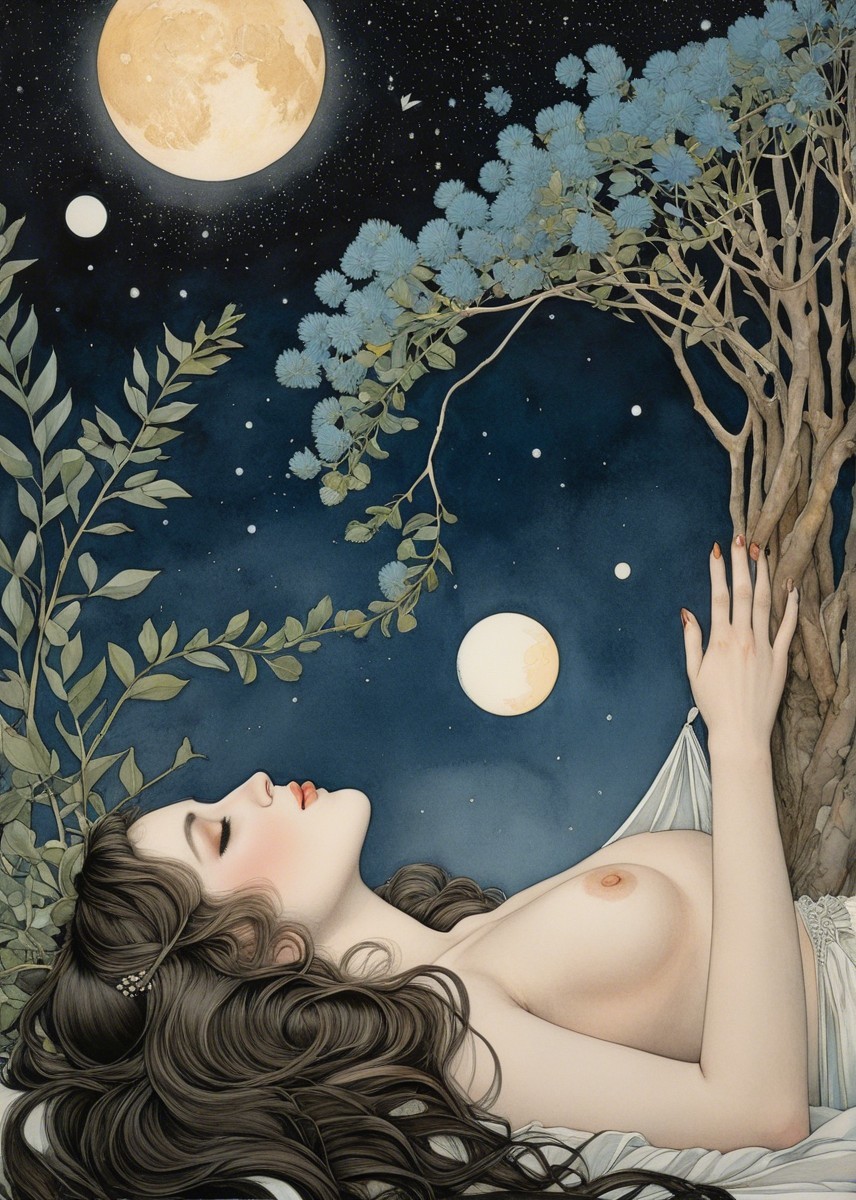 A serene woman with flowing hair rests against a tree under a starlit sky. The moon casts a gentle glow on her, highlighting delicate flowers and leaves surrounding her peaceful figure.