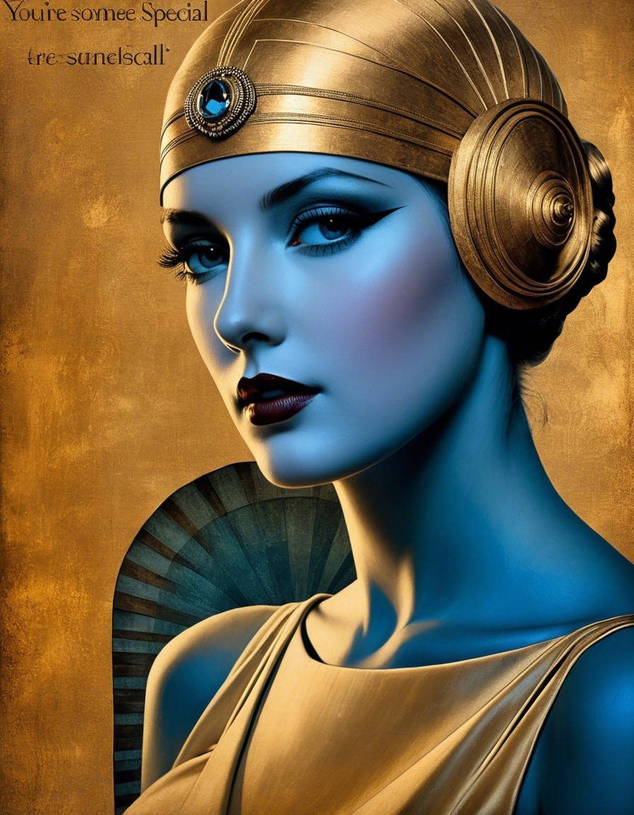 A striking portrait of a blue-skinned woman with vintage styling, featuring a golden headband and earrings. She cradles a black and white cat, creating a captivating and artistic contrast.