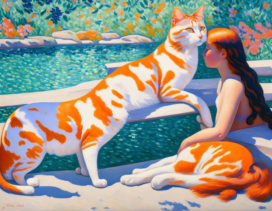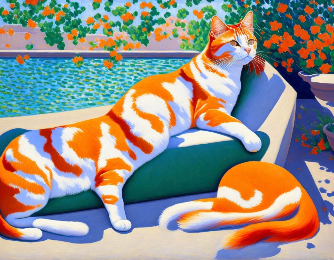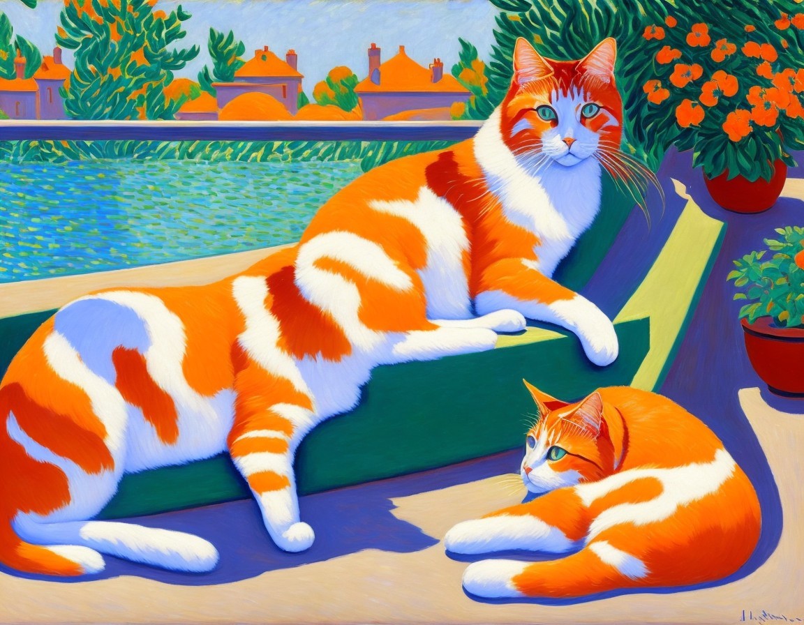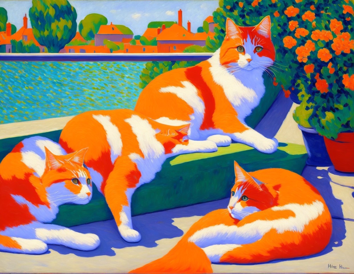 Vibrant painting of five orange and white cats lounging in a sunny garden with lush greenery and bright flowers.
