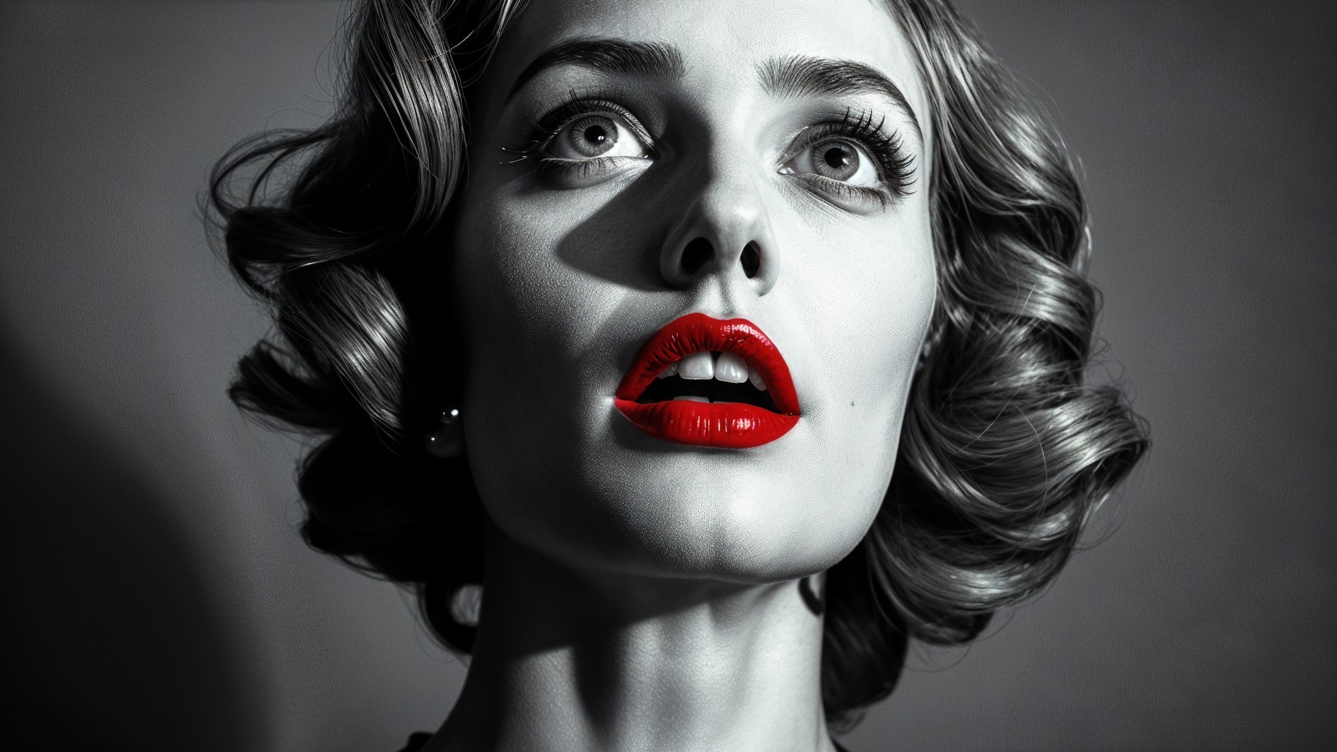 A striking black-and-white portrait of a woman with glamorous styled hair and bold red lips, exuding a classic, timeless elegance and showcasing intense expression and beauty.