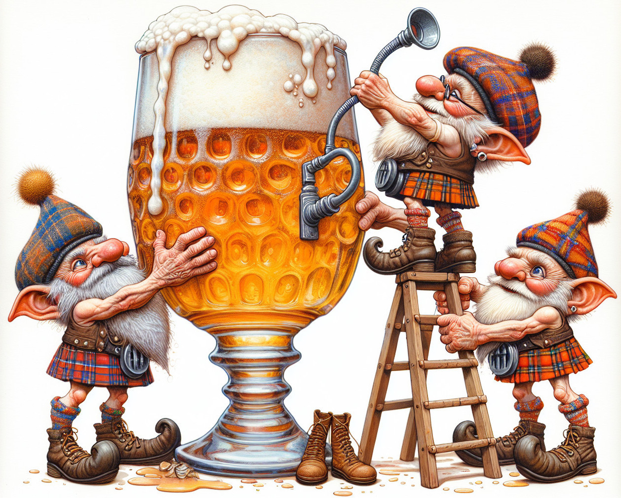 A whimsical scene featuring small, playful gnomes in kilts, one working a tap on a giant beer glass while others assist, creating a festive and humorous atmosphere around the drink.