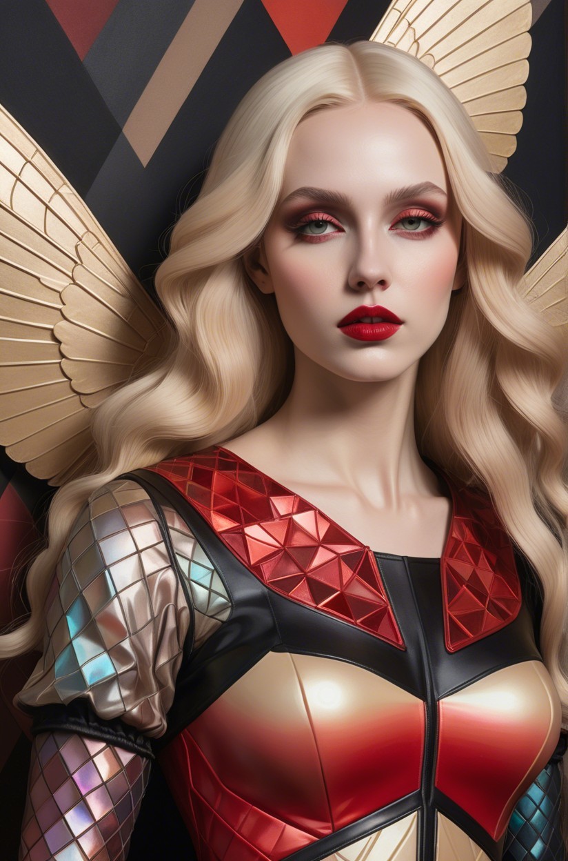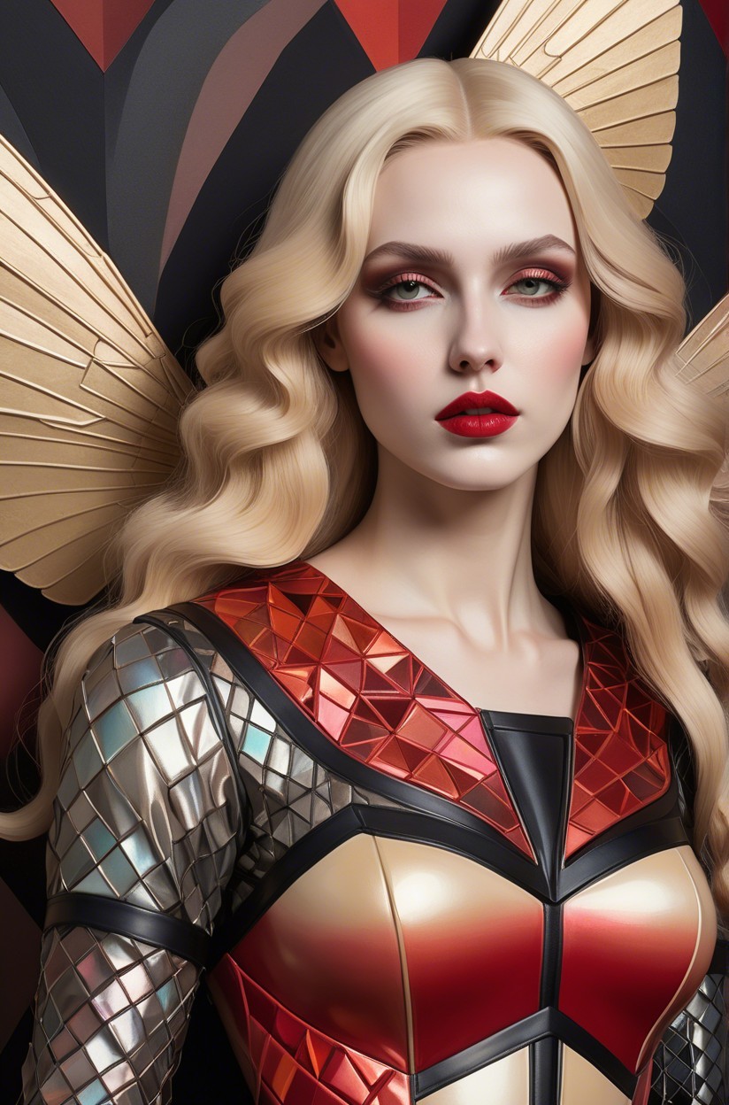 A striking figure with long, wavy blonde hair and bold red makeup. She wears a metallic, form-fitting costume with red and gold accents, complemented by large, stylish wings behind her.