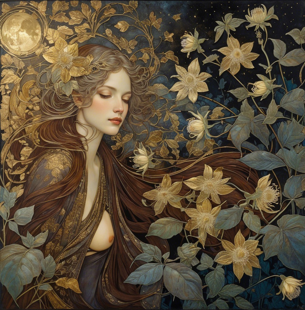patina etched eau forte on metal, moonlit passionflower meadows, distant uplands town, (deeply etched) lines, intricately detailed crisp quality, gold leaf highlights, dark mood, style of Rebecca Guay, style of Mandy Jurgens, composition must originate from a human artist, silvered moonlit edged light and shade, stormy, (cinematic) in the style of Alexander Jansson. by Catrin Welz-Stein, Michael Parkes. By Rob Gonsalves, Markus Pierson