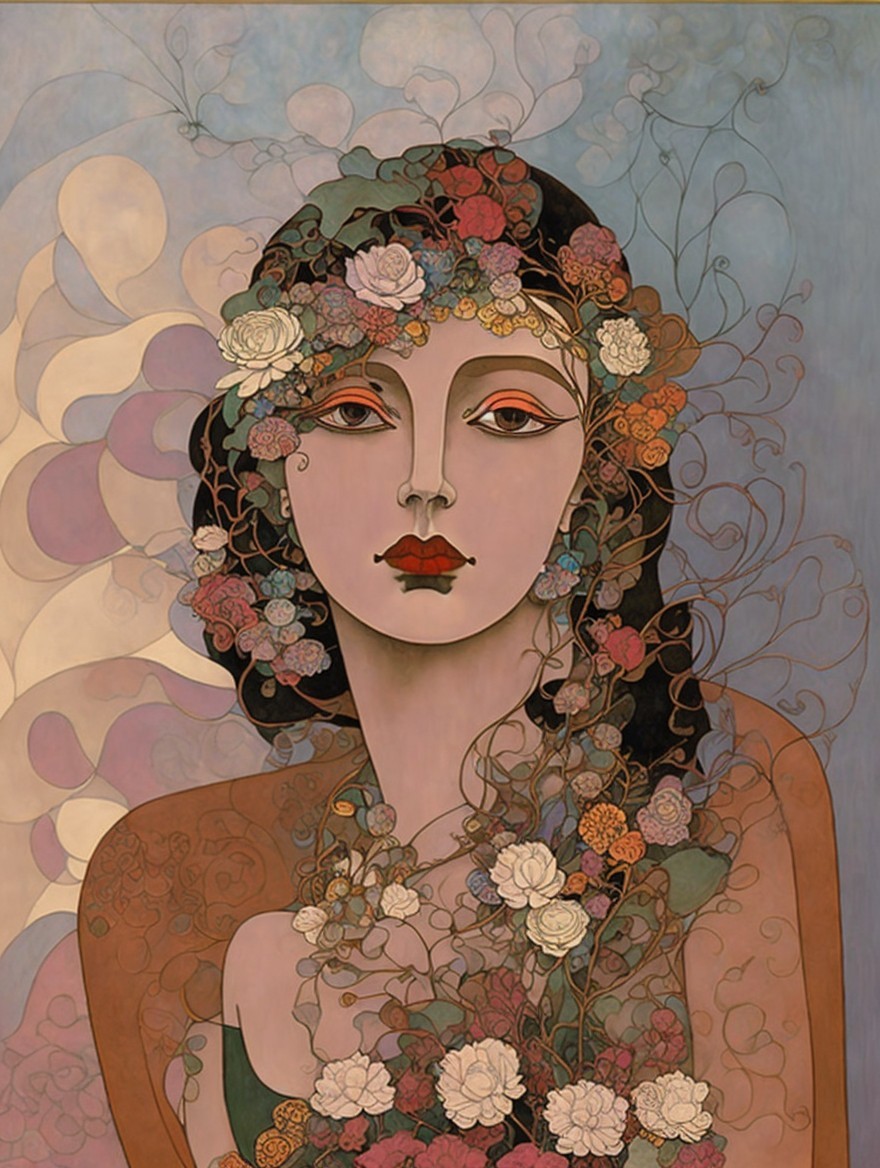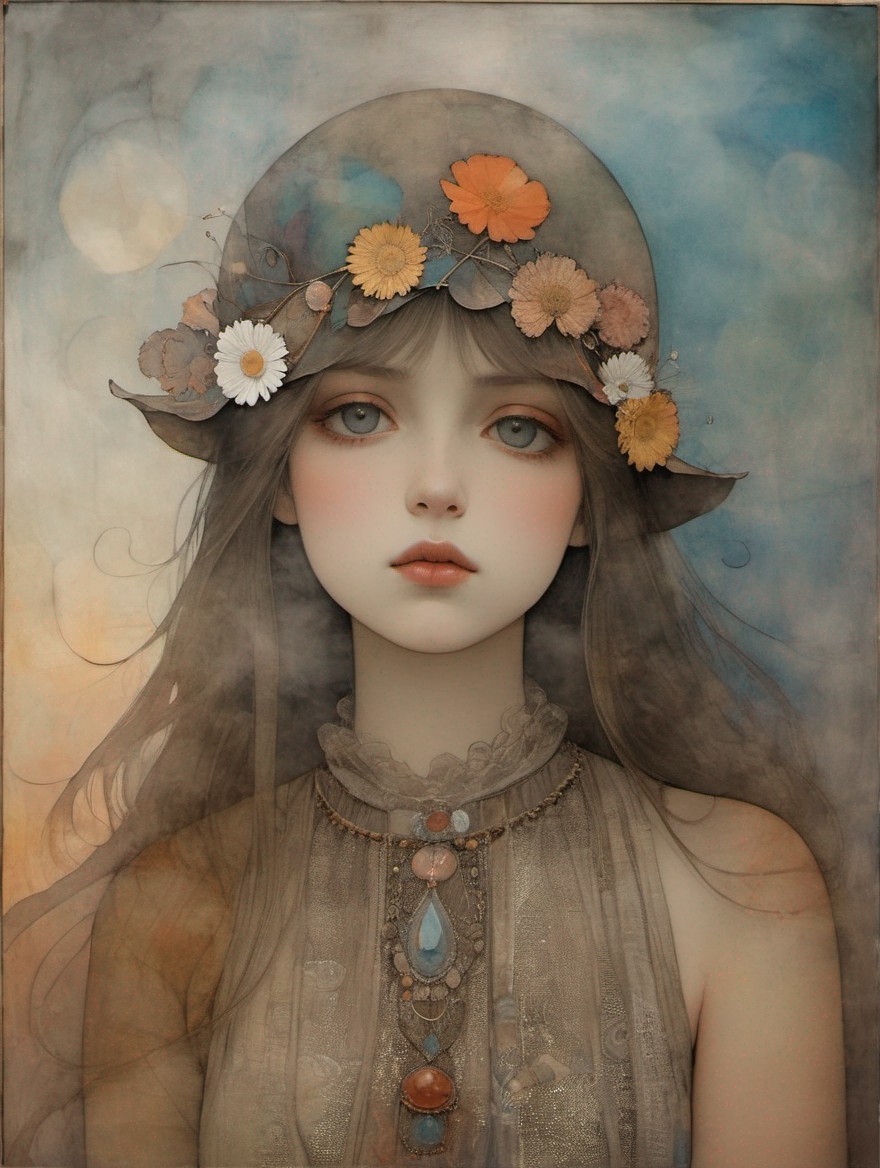 A portrait of a woman with a floral wreath, braided hair, and vintage attire, emanating a serene, ethereal beauty.