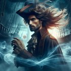 A striking pirate with flowing hair and a dramatic hat holds vibrant, swirling orbs in each hand. The background features a mysterious, illuminated pirate setting, enhancing the adventurous atmosphere.