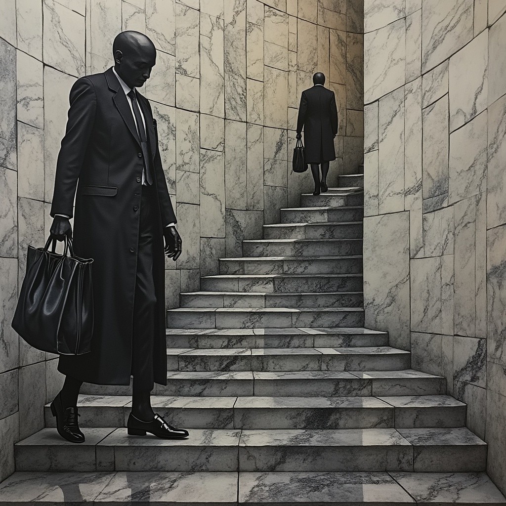 The artwork features two figures in black cloaks navigating a staircase in a geometric, monochromatic space. The setting conveys an atmosphere of mystery and introspection.