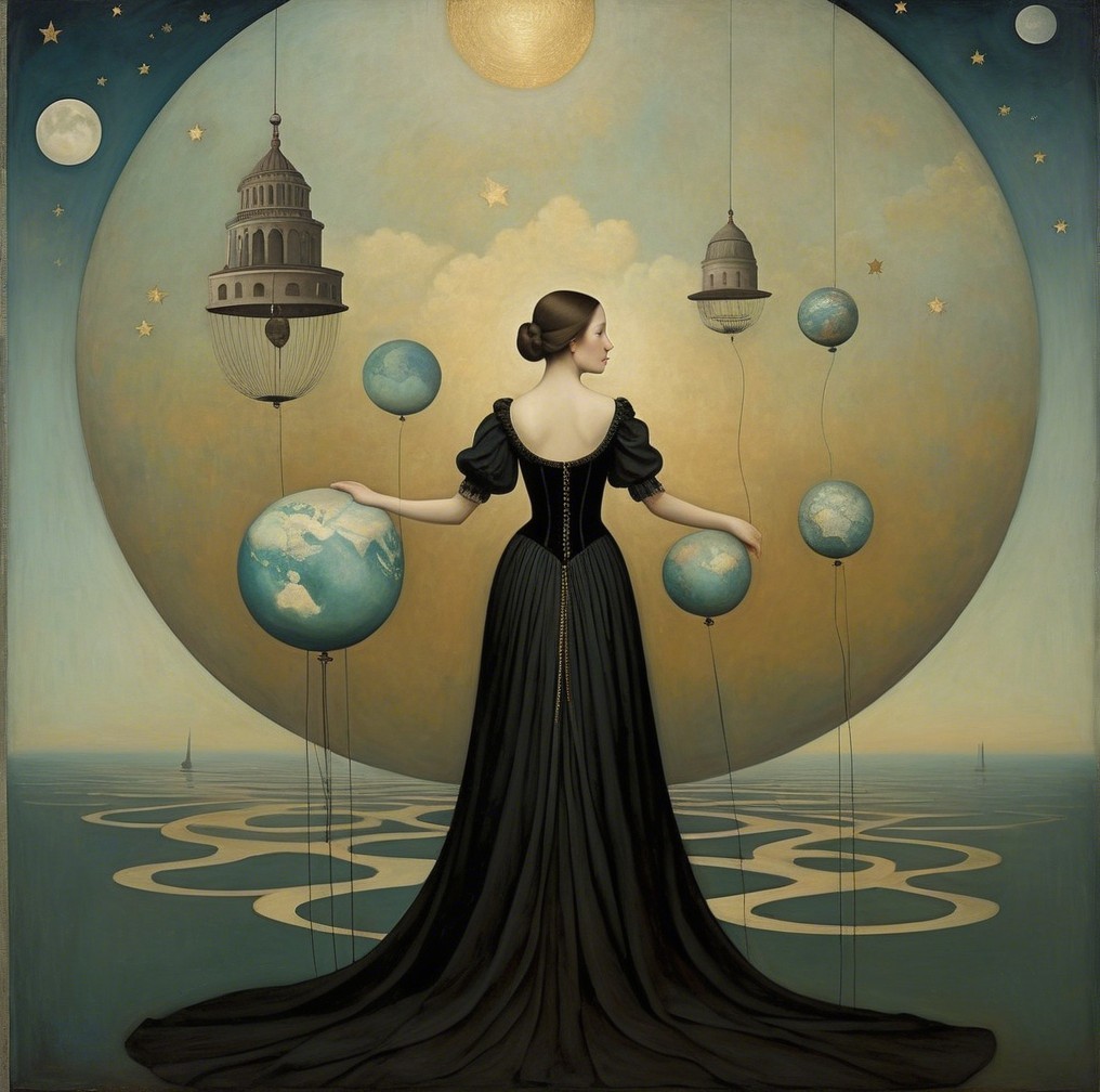A woman in a flowing black gown stands by a serene body of water, holding a sphere. Behind her, a large moon and dreamlike lanterns float against a soft, starry sky. An air of mystique surrounds her.