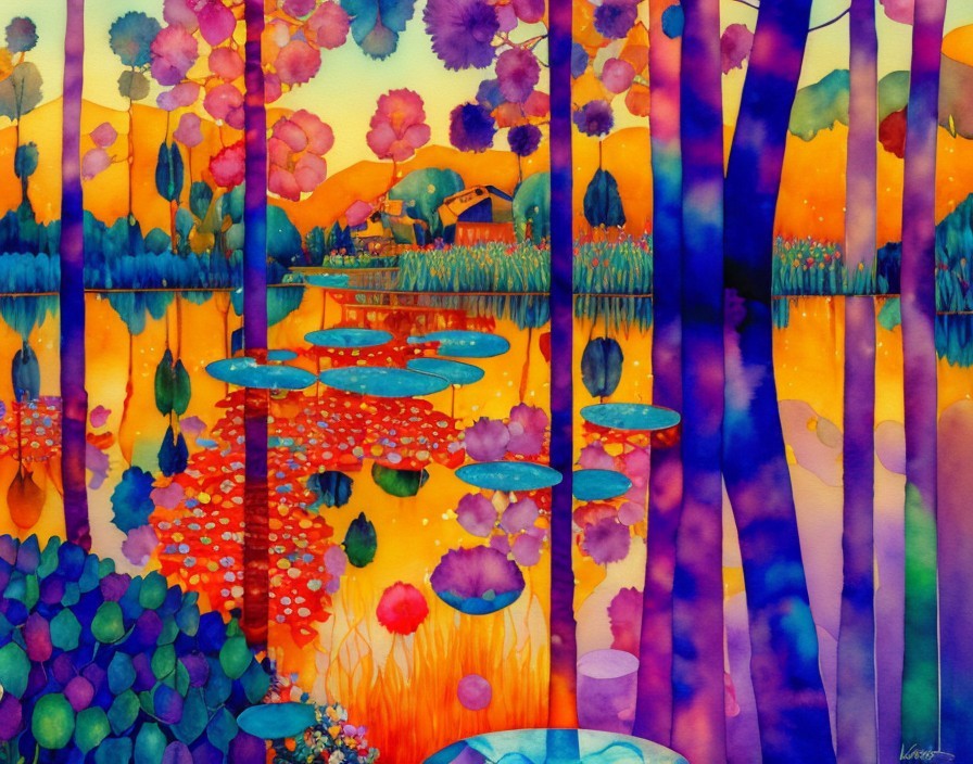 Prompt: Wide view, 3D watercolor patchwork, in the very best style of Gustav Klimt, spectacular sunrise over a topaz pond reflecting sun and [a beautiful garden with numerous flowers in vibrant saturated colors], slender trees and plants with delicate leaves in shades of azure blue and teal and gold, golden sunrise rays shimmering over the scene, detailed intricate, satiny, high quality, elegant, highly detailed, glistening magic style with elements in the style of Jan Toorop