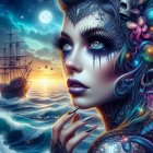 A stunning woman with vibrant, multicolored hair and dramatic makeup stands against a sunset by the ocean. Intricate patterns adorn her face, capturing a magical, ethereal vibe.