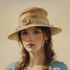 A young woman with long, wavy brown hair and striking blue eyes gazes softly at the camera. She wears a stylish straw hat adorned with decorative elements, set against a serene outdoor backdrop.