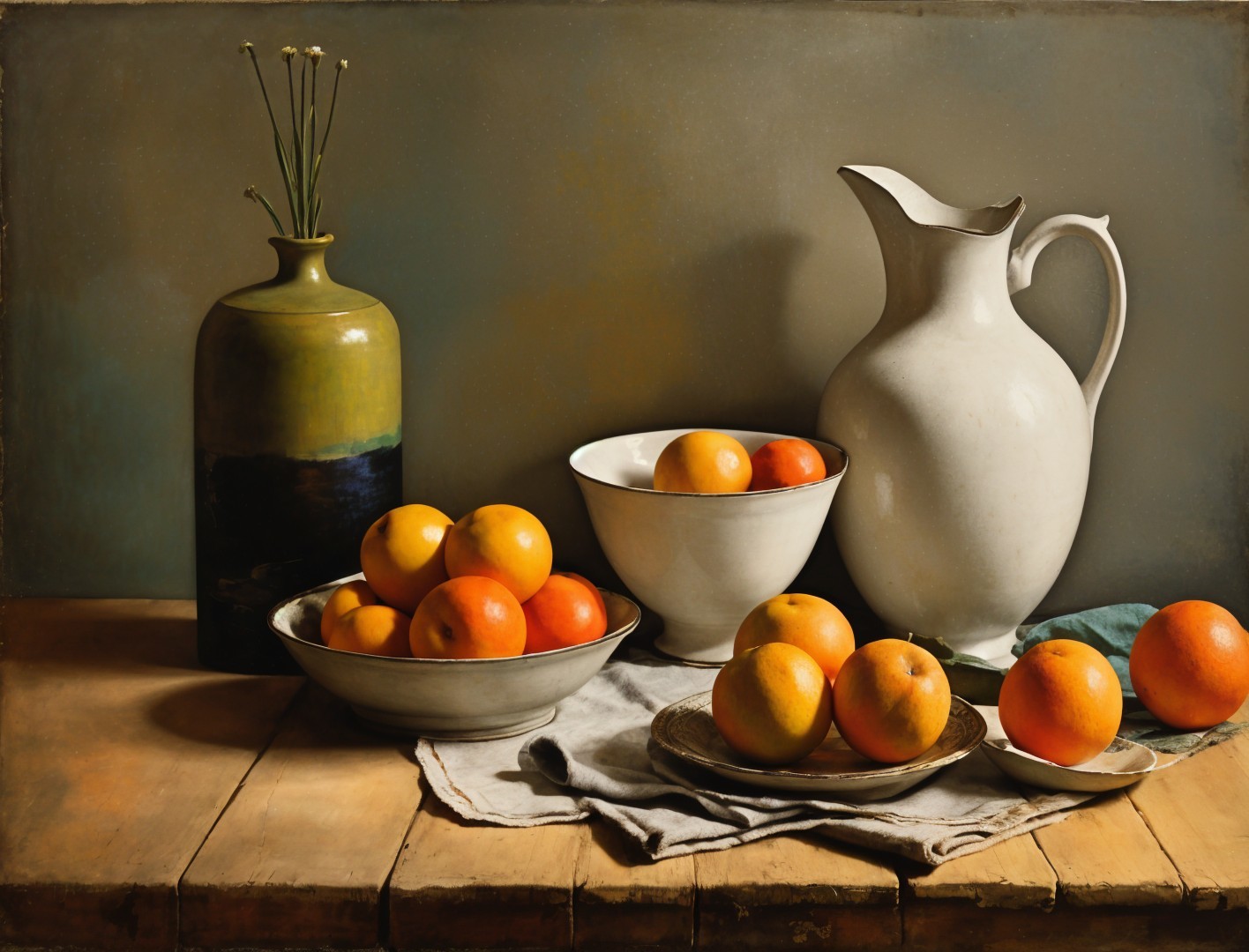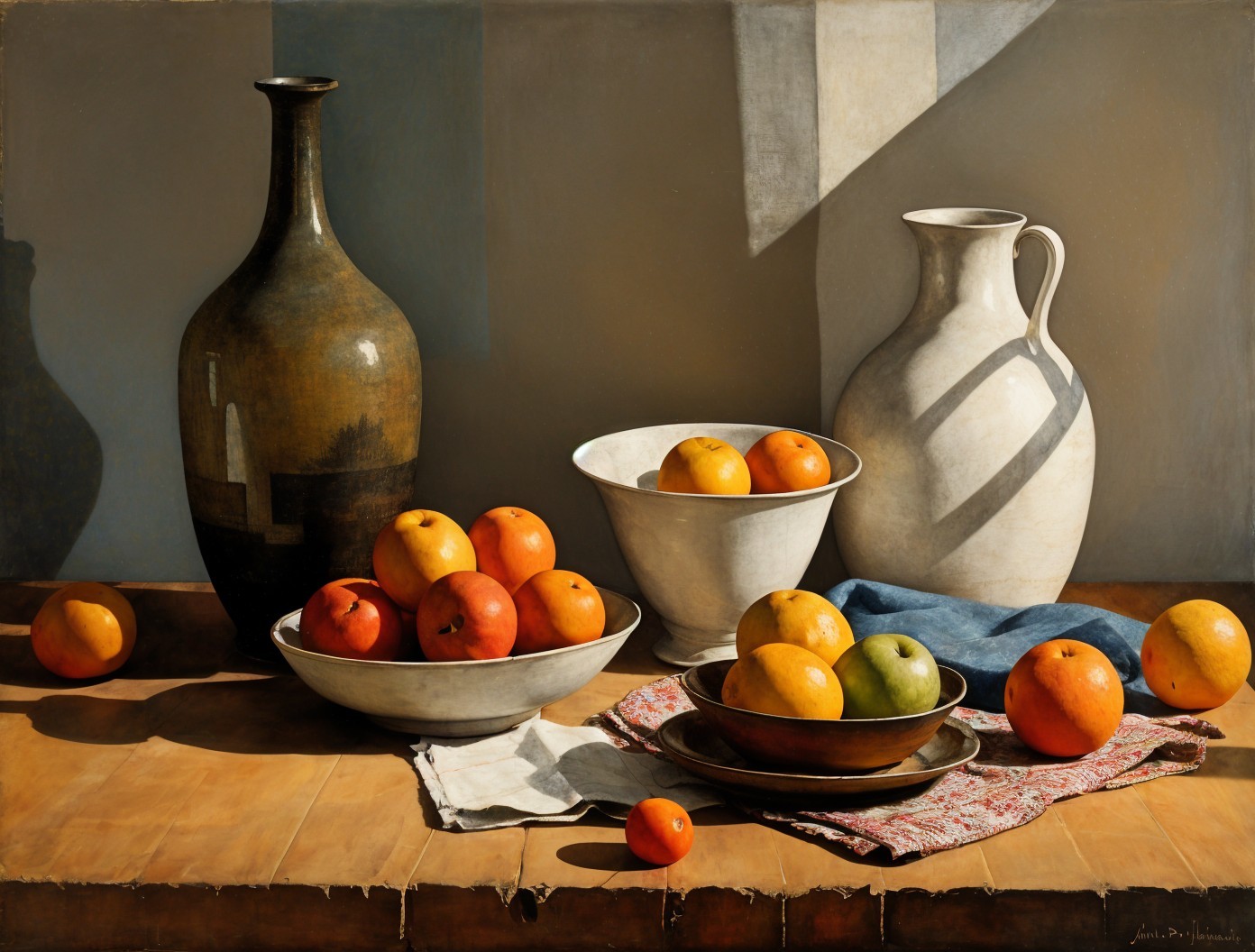 A still life featuring a vase, a pitcher, and bowls filled with vibrant apples and oranges, set against softly lit shadows and a textured backdrop. Daisies add a delicate touch.