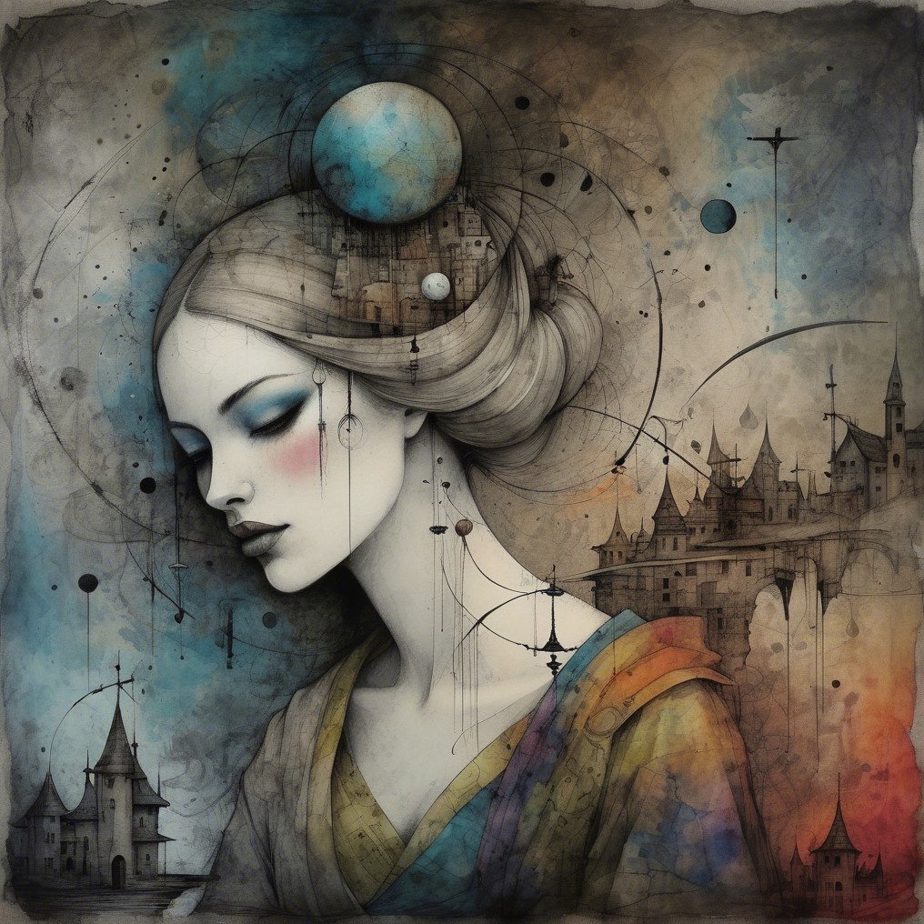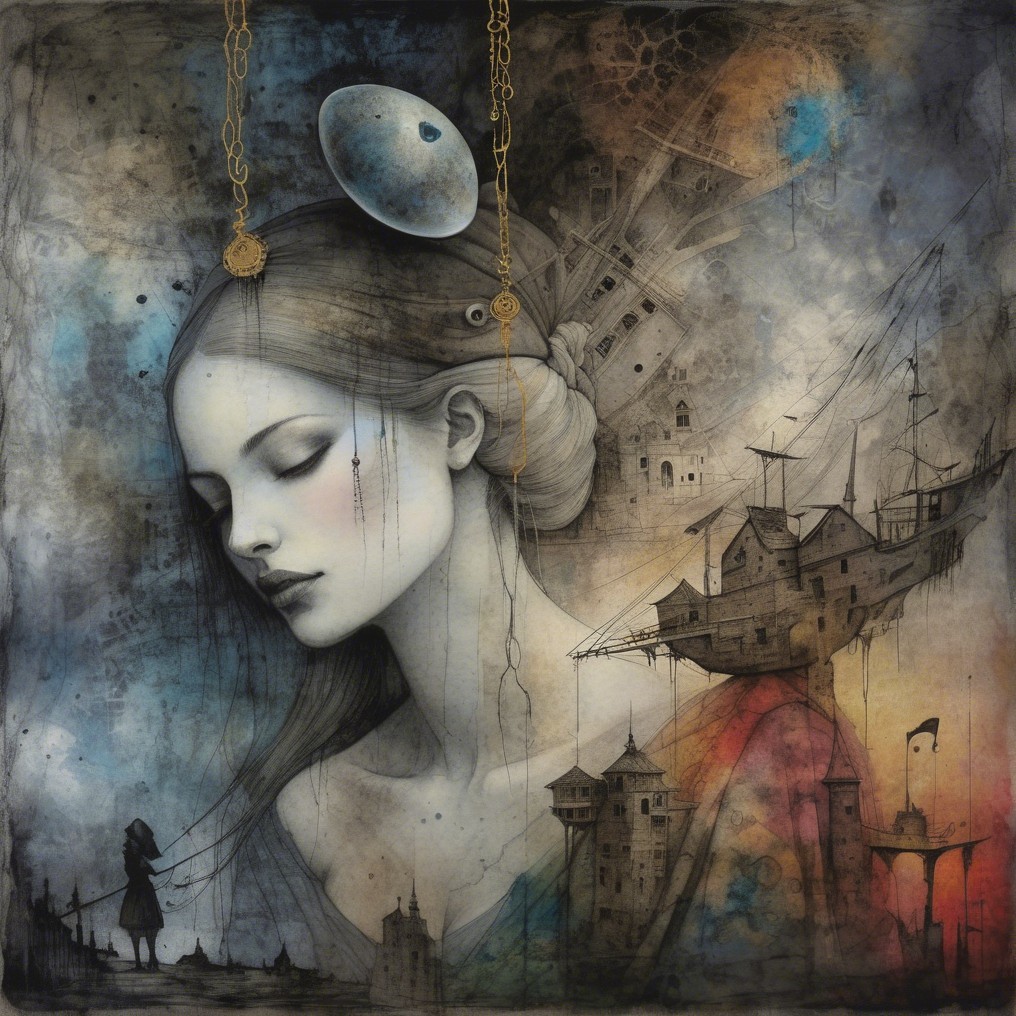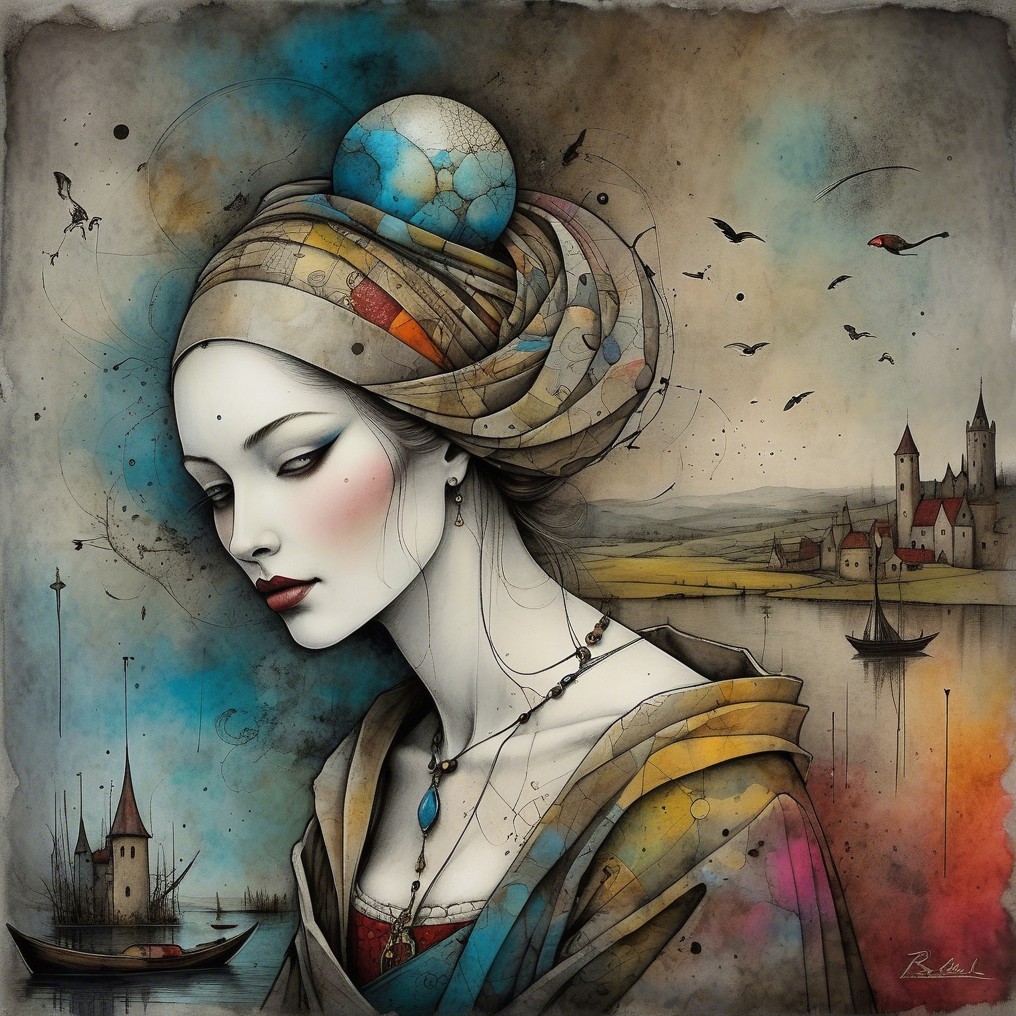 The image features a stylized woman in a colorful headscarf and elegant clothing, set against a serene landscape with a lake and distant village. Artistic elements enhance the dreamy atmosphere.